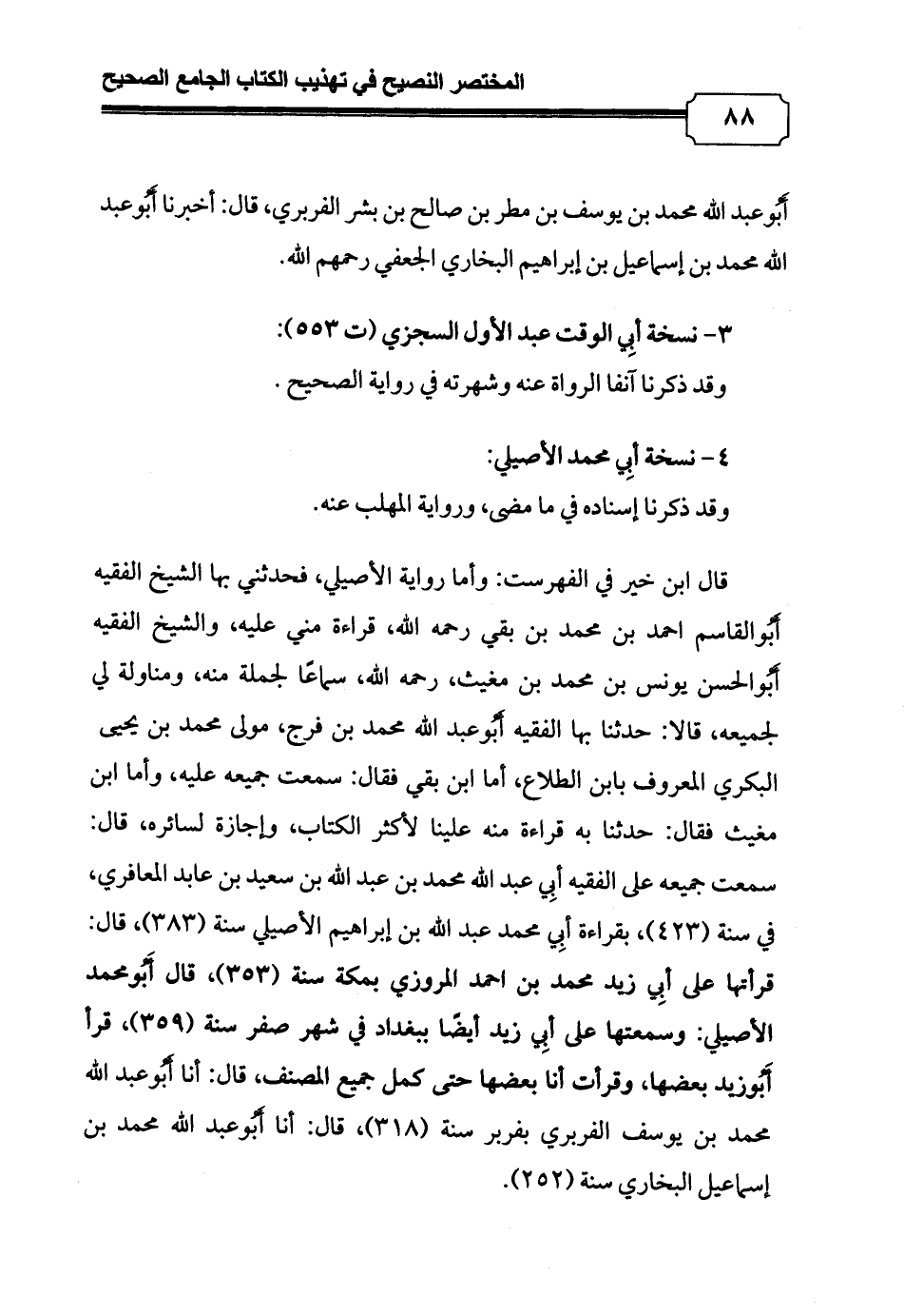 قال ابن خير في الفهرست: وأما رواية الأصيلي، فحدثني بها الشيخ الفقيه أَبُوالقاسم احمد بن محمد بن بقي رحمه الله، قراءة مني عليه، والشيخ الفقيه أَبُوالحسن يونس بن محمد بن مغيث، رحمه الله، سماعًا لجملة منه، ومناولة لي لجميعه، قالا: حدثنا بها الفقيه أَبُوعبد الله محمد بن فرج، مولى محمد بن يحيى البكري المعروف بابن الطلاع، أما ابن بقي فقال: سمعت جميعه عليه، وأما ابن مغيث فقال: حدثنا به قراءة منه علينا لأكثر الكتاب، وإجازة لسائره، قال: سمعت جميعه على الفقيه أبِي عبد الله محمد بن عبد الله بن سعيد بن عابد المعافري، في سنة (423)، بقراءة أبِي محمد عبد الله بن إبراهيم الأصيلي سنة (383)، قال: قرأتها على أبِي زيد محمد بن احمد المروزي بمكة سنة (353)، قال أَبُومحمد الأصيلي: وسمعتها على أبِي زيد أيضًا ببغداد في شهر صفر سنة (359)، قرأ أَبُوزيد بعضها، وقرأت أنا بعضها حتى كمل جميع المصنف، قال: أنا أَبُوعبد الله محمد بن يوسف الفربري بفربر سنة (318) , قال: أنا أَبُوعبد الله محمد بن إسماعيل البخاري سنة (252).