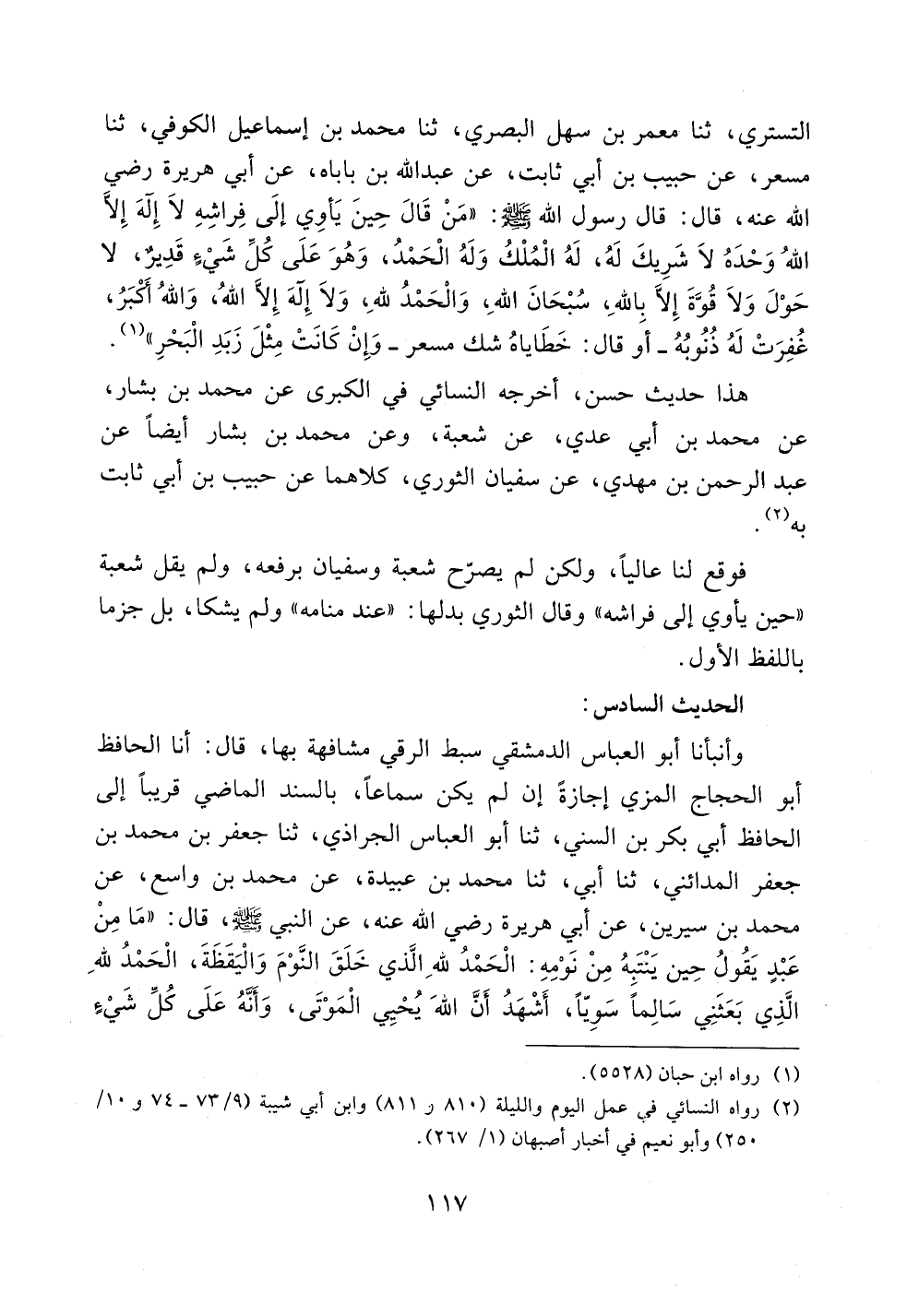 التستري، ثنا معمر بن سهل البصري، ثنا محمد بن إسماعيل الكوفي، ثنا مسعر، عن حبيب بن أبي ثابت، عن عبد الله بن باباه، عن أبي هريرة رضي الله عنه، قال: قال رسول الله صلى الله عليه وسلم: ((من قال حين يأوي إلى فراشه لا إله إلا الله وحده لا شريك له، له الملك وله الحمد، وهو على كل شيءٍ قديرٌ، لا حول ولا قوة إلا بالله، سبحان الله، والحمد لله، ولا إله إلا الله، والله أكبر، غفرت له ذنوبه -أو قال: خطاياه شك مسعر- وإن كانت مثل زبد البحر)).