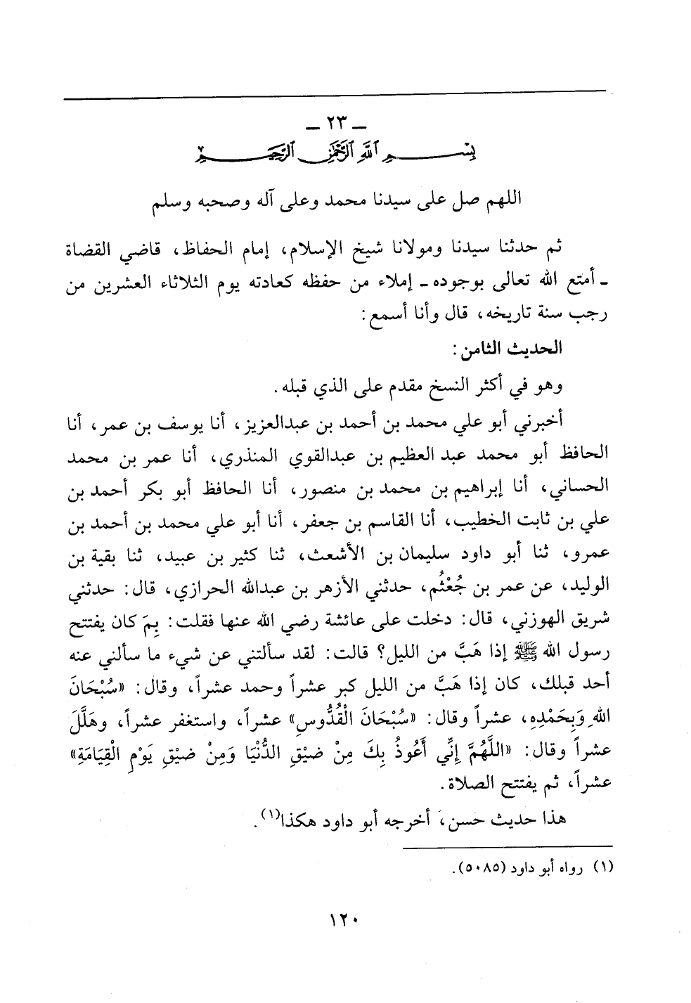 أخبرني أبو علي محمد بن أحمد بن عبد العزيز، أنا يوسف بن عمر، أنا الحافظ أبو محمد عبد العظيم بن عبد القوي المنذري، أنا عمر بن محمد الحساني، أنا إبراهيم بن محمد بن منصور، أنا الحافظ أبو بكر أحمد بن علي بن ثابت الخطيب، أنا القاسم بن جعفر، أنا أبو علي محمد بن أحمد بن عمرو، ثنا أبو داود سليمان بن الأشعث، ثنا كثير بن عبيد، ثنا بقية بن الوليد، عن عمر بن جعثم، حدثني الأزهر بن عبد الله الحرازي، قال: حدثني شريق الهوزني، قال: دخلت على عائشة رضي الله عنها فقلت: بم كان يفتتح رسول الله صلى الله عليه وسلم إذا هب من الليل؟ قالت: لقد سألتني عن شيء ما سألني عنه أحد قبلك، كان إذا هب من الليل كبر عشراً وحمد عشراً، وقال: ((سبحان الله وبحمده، عشراً وقال: ((سبحان القدوس)) عشراً، واستغفر عشراً، وهلل عشراً وقال: ((اللهم إني أعوذ بك من ضيق الدنيا ومن ضيق يوم القيامة)) عشراً، ثم يفتتح الصلاة.