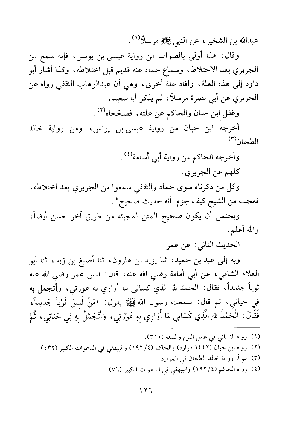 وبه إلى عبد بن حميد، ثنا يزيد بن هارون، ثنا أصبغ بن زيد، ثنا أبو العلاء الشامي، عن أبي أمامة رضي الله عنه، قال: لبس عمر رضي الله عنه ثوباً جديداً، فقال: الحمد لله الذي كساني ما أواري به عورتي، وأتجمل به في حياتي، ثم قال: سمعت رسول الله صلى الله عليه وسلم يقول: ((من لبس ثوباً جديداً فقال: الحمد لله الذي كساني ما أواري به عورتي، وأتجمل به في حياتي، ثم