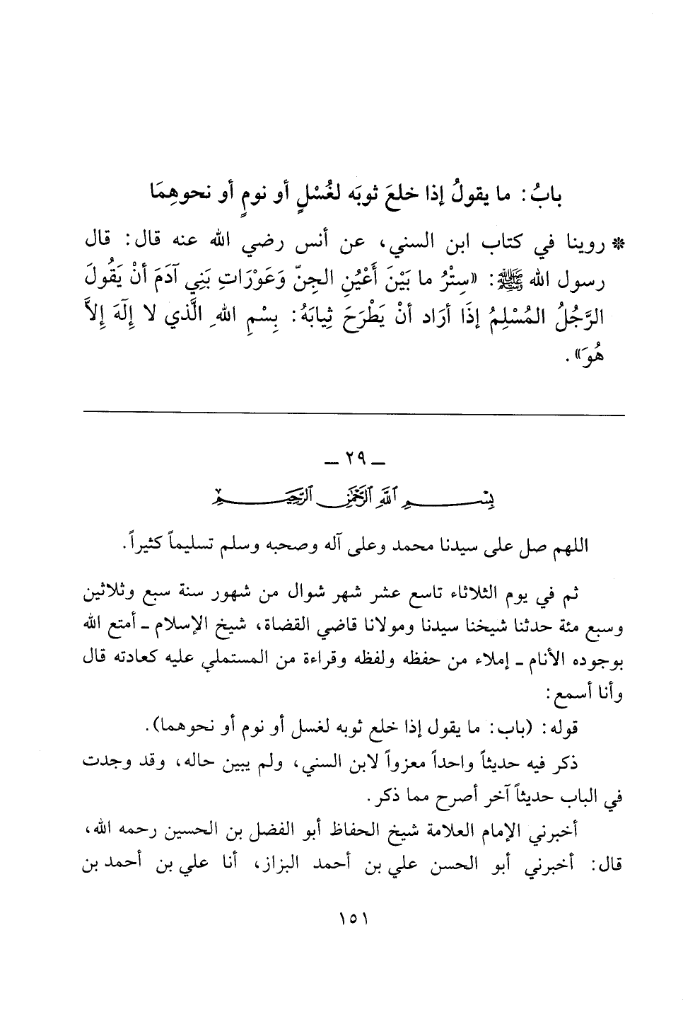 روينا في كتاب ابن السني، عن أنس رضي الله عنه قال: قال رسول الله صلى الله عليه وسلم: ((ستر ما بين أعين الجن وعورات بني آدم أن يقول الرجل المسلم إذا أراد أن يطرح ثيابه: بسم الله الذي لا إله إلا هو)).]]