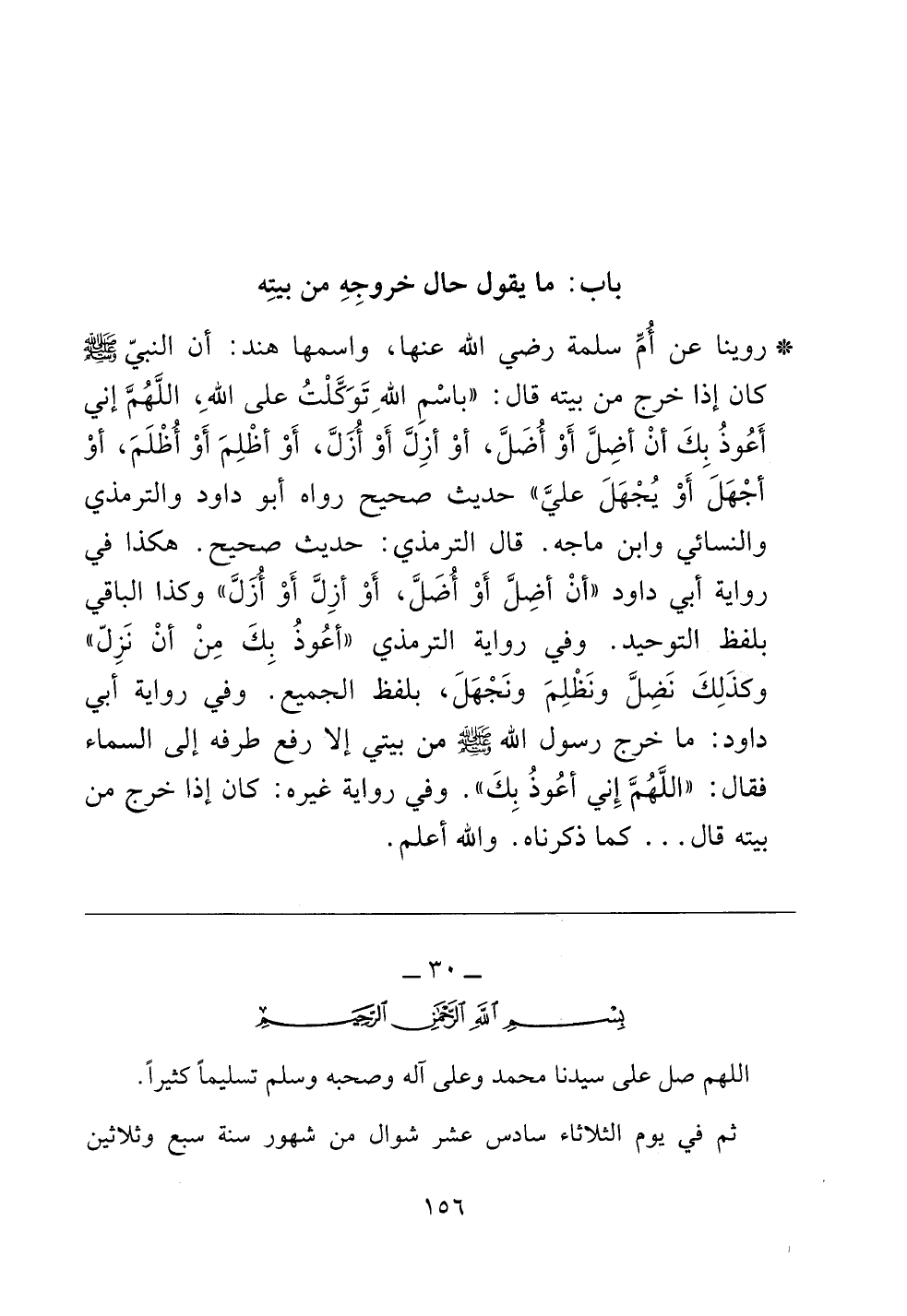 روينا عن أم سلمة رضي الله عنها، واسمها هند: أن النبي صلى الله عليه وسلم كان إذا خرج من بيته قال: ((باسم الله توكلت على الله، اللهم إني أعوذ بك أن أَضل أو أُضل، أو أَزل أو أُزل، أو أَظلم أو أُظلم، أو أَجهل أو يُجهل علي)) حديث صحيح رواه أبو داود والترمذي والنسائي وابن ماجه. قال الترمذي: حديث صحيح، هكذا في رواية أبي داود ((أن أَضل أو أُضل، أو أَزل أو أُزل)) وكذا الباقي بلفظ التوحيد. وفي رواية الترمذي ((أعوذ بك من أن نزل)) وكذلك نضل ونظلم ونجهل، بلفظ الجميع. وفي رواية أبي داود: ما خرج رسول الله صلى الله عليه وسلم من بيتي إلا رفع طرفه إلى السماء فقال: ((اللهم إني أعوذ بك)). وفي رواية غيره: كان إذا خرج من بيته قال .. كما ذكرناه. والله أعلم.]]