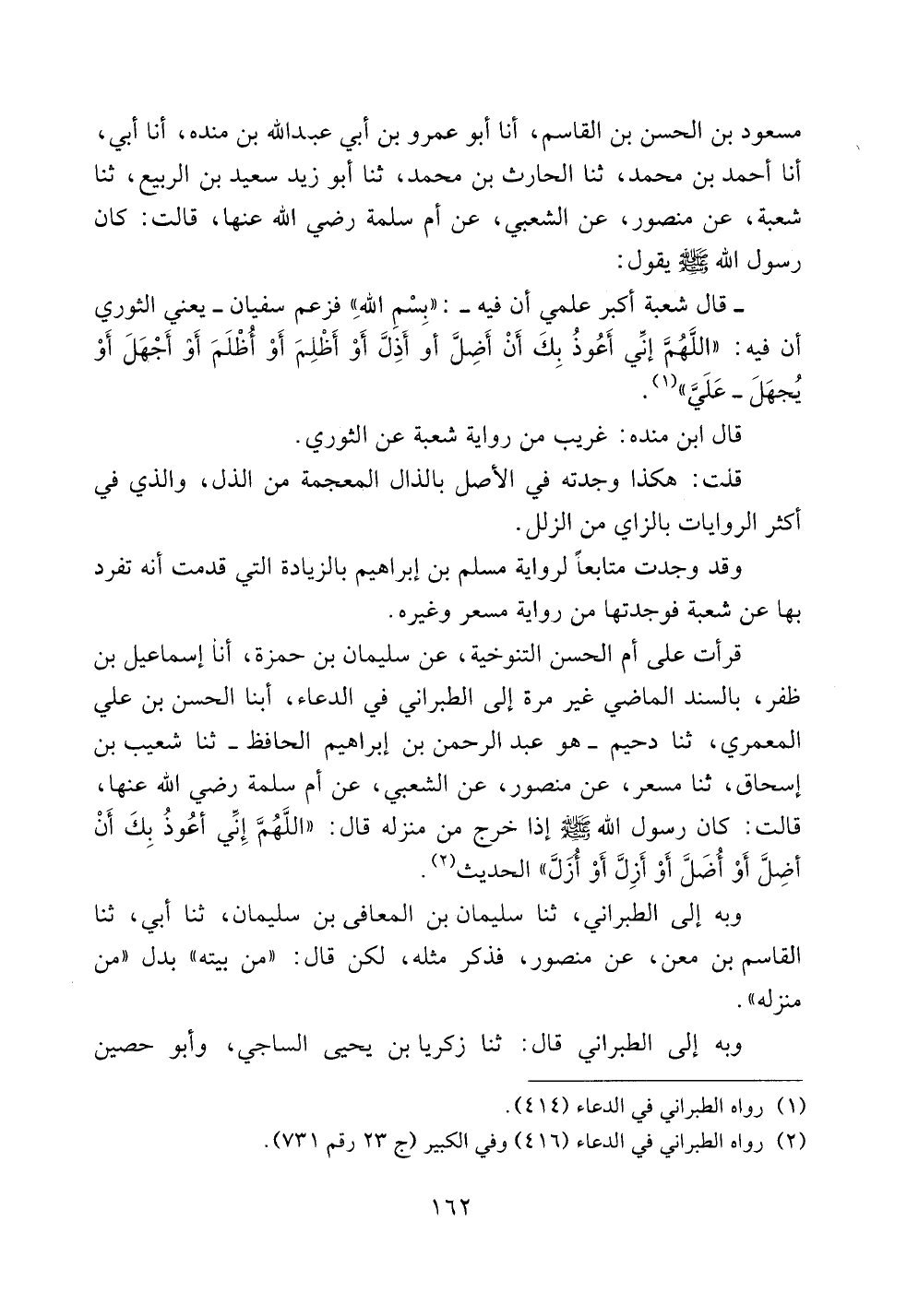 قرأت على أم الحسن التنوخية، عن سليمان بن حمزة، أنا إسماعيل بن ظفر، بالسند الماضي غير مرة إلى الطبراني في الدعاء، أبنا الحسن بن علي المعمري، ثنا دحيم -هو عبد الرحمن بن إبراهيم الحافظ- ثنا شعيب بن إسحاق، ثنا مسعر، عن منصور، عن الشعبي، عن أم سلمة رضي الله عنها، قالت: كان رسول الله صلى الله عليه وسلم إذا خرج من منزله قال: ((اللهم إني أعوذ بك أن أَضل أو أُضل أو أَزل أو أُزل)) الحديث.