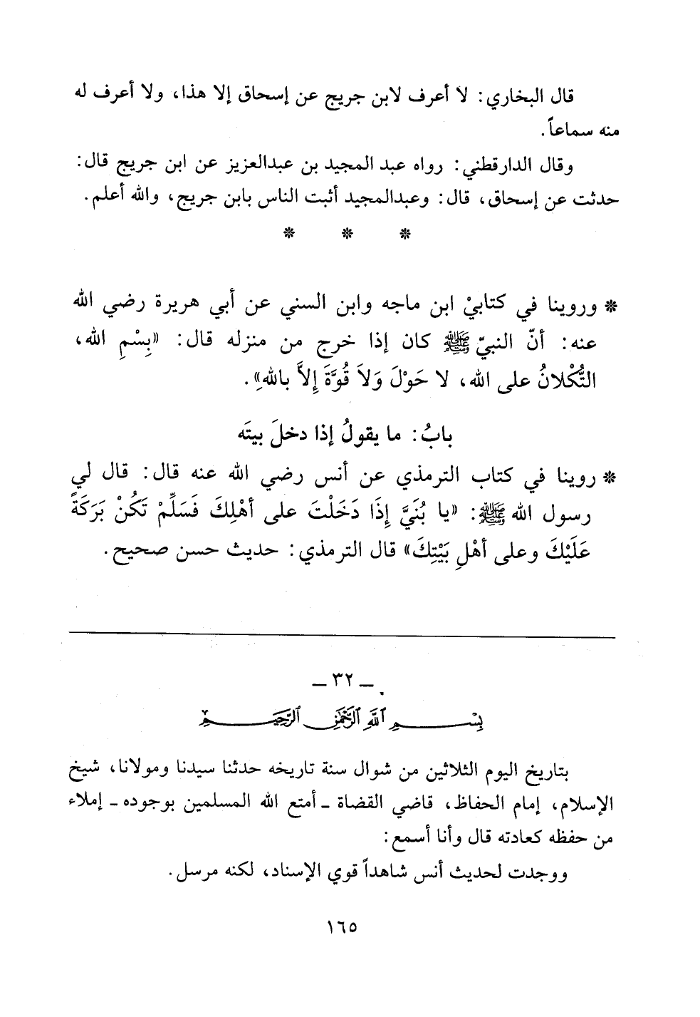 بتاريخ اليوم الثلاثين من شوال سنة تاريخه حدثنا سيدنا ومولانا، شيخ الإسلام، إمام الحفاظ، قاضي القضاة -أمتع الله المسلمين بوجوده- إملاء من حفظه كعادته قال وأنا أسمع: