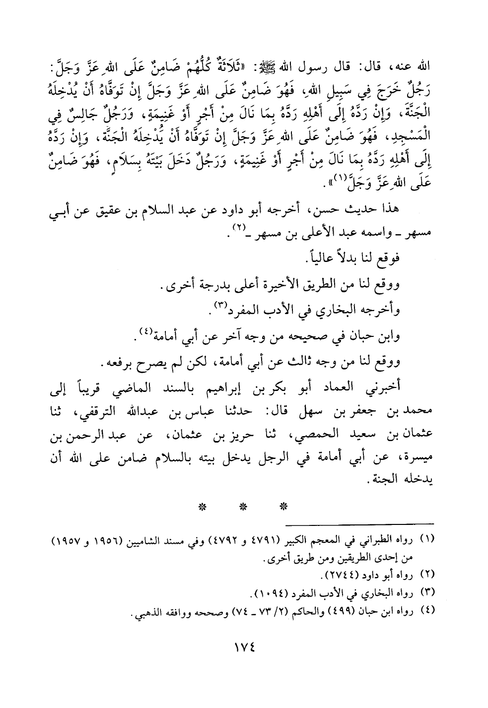 الله عنه، قال: قال رسول الله صلى الله عليه وسلم: ((ثلاثة كلهم ضامنٌ على الله عز وجل: رجلٌ خرج في سبيل الله، فهو ضامنٌ على الله عز وجل إن توفاه أن يدخله الجنة، وإن رده إلى أهله رده بما نال من أجرٍ أو غنيمةٍ، ورجلٌ جالسٌ في المسجد، فهو ضامنٌ على الله عز وجل إن توفاه أن يدخله الجنة، وإن رده إلى أهله رده بما نال من أجرٍ أو غنيمةٍ، ورجلٌ دخل بيته بسلامٍ، فهو ضامنٌ على الله عز وجل.