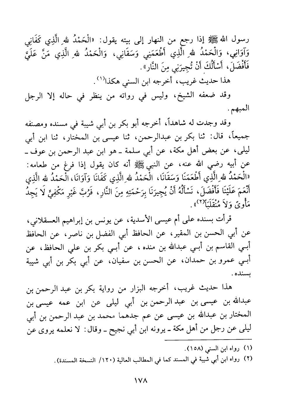 قرأت بسنده على أم عيسى الأسدية، عن يونس بن إبراهيم العسقلاني، عن أبي الحسن بن المقير، عن الحافظ أبي الفضل بن ناصر، عن الحافظ أبي القاسم بن أبي عبد الله بن منده، عن أبي بكر بن علي الحافظ، عن أبي عمرو بن حمدان، عن الحسن بن سفيان، عن أبي بكر بن أبي شيبة بسنده.