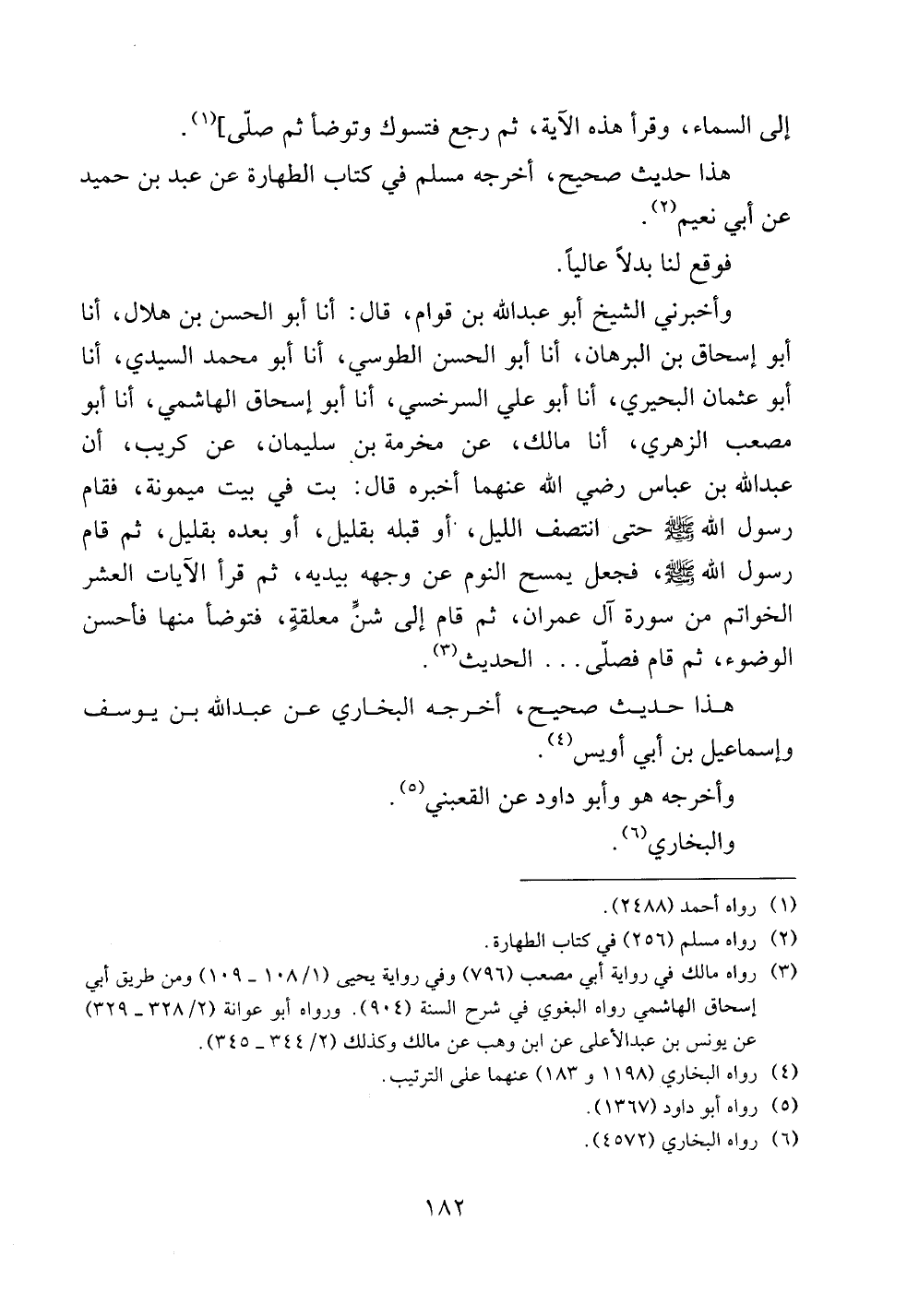 وأخبرني الشيخ أبو عبد الله بن قوام، قال: أنا أبو الحسن بن هلال، أنا أبو إسحاق بن البرهان، أنا أبو الحسن الطوسي، أنا أبو محمد السيدي، أنا أبو عثمان البحيري، أنا أبو علي السرخسي، أنا أبو إسحاق الهاشمي، أنا أبو مصعب الزهري، أنا مالك، عن مخرمة بن سليمان، عن كريب، أن عبد الله بن عباس رضي الله عنهما أخبره قال: بت في بيت ميمونة، فقام رسول الله صلى الله عليه وسلم حتى انتصف الليل، أو قبله بقليل، أو بعده بقليل، ثم قام رسول الله صلى الله عليه وسلم، فجعل يمسح النوم عن وجهه بيديه، ثم قرأ الآيات العشر الخواتم من سورة آل عمران، ثم قام إلى شق معلقةٍ، فتوضأ منها فأحسن الوضوء، ثم قام فصلى .. الحديث.