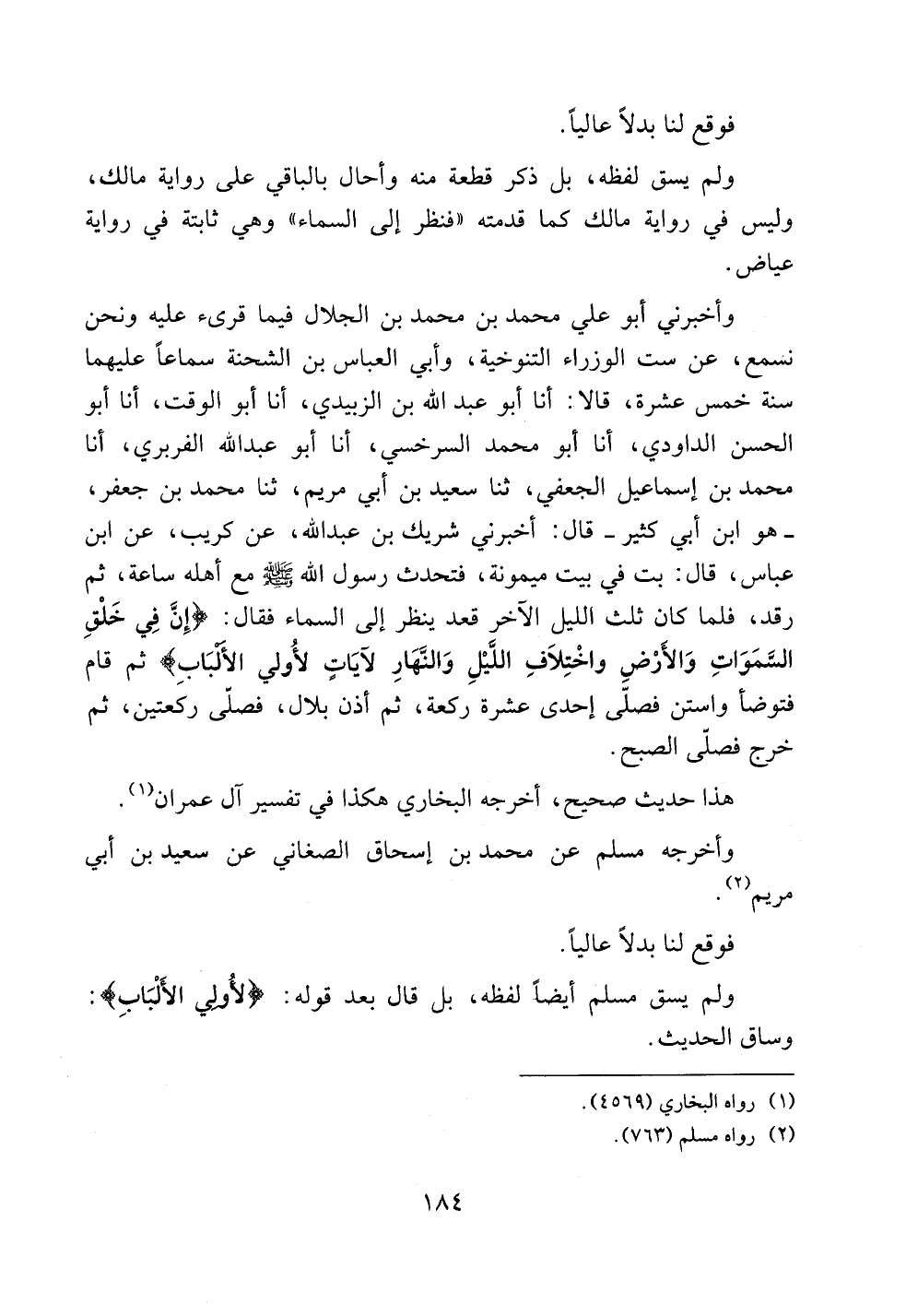 وأخبرني أبو علي محمد بن محمد بن الجلال فيما قرئ عليه ونحن نسمع، عن ست الوزراء التنوخية، وأبي العباس بن الشحنة سماعاً عليهما سنة خمس عشرة، قالا: أنا أبو عبد الله بن الزبيدي، أنا أبو الوقت، أنا أبو الحسن الداودي، أنا أبو محمد السرخسي، أنا أبو عبد الله الفربري، أنا محمد بن إسماعيل الجعفي، ثنا سعيد بن أبي مريم، ثنا محمد بن جعفر، -هو ابن أبي كثير- قال: أخبرني شريك بن عبد الله، عن كريب، عن ابن عباس، قال: بت في بيت ميمونة، فتحدث رسول الله صلى الله عليه وسلم مع أهله ساعة، ثم رقد، فلما كان ثلث الليل الآخر قعد ينظر إلى السماء فقال: {إن في خلق السموات والأرض واختلاف الليل والنهار لآياتٍ لأولي الألباب} ثم قام فتوضأ واستن فصلى إحدى عشرة ركعة، ثم أذن بلال، فصلى ركعتين، ثم خرج فصلى الصبح.