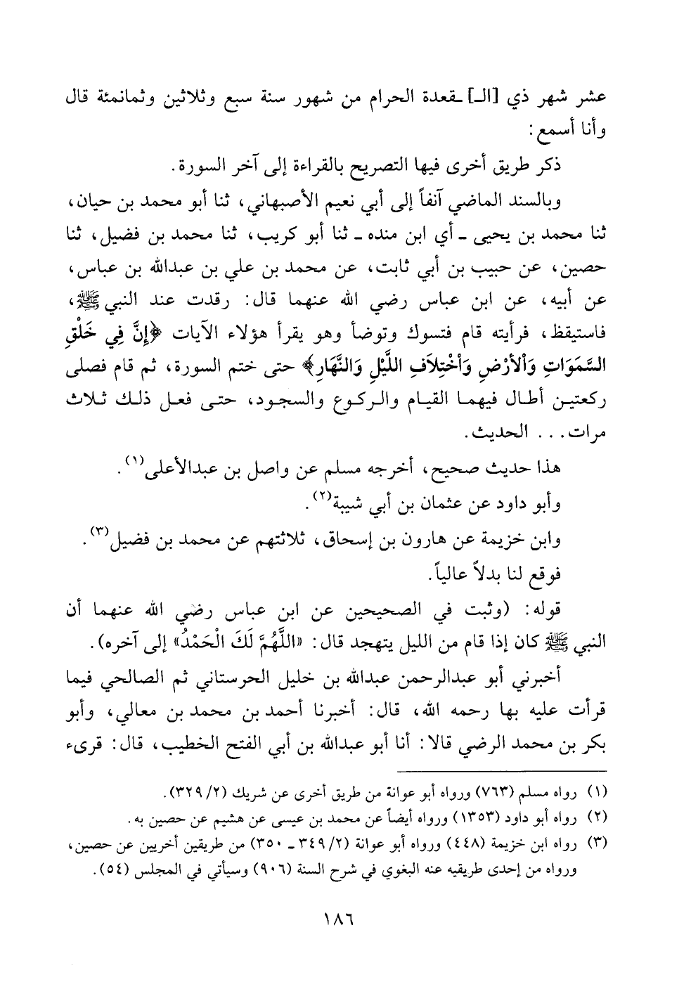 وبالسند الماضي آنفاً إلى أبي نعيم الأصبهاني، ثنا أبو محمد بن حيان، ثنا محمد بن يحيى -أي ابن منده- ثنا أبو كريب، ثنا محمد بن فضيل، ثنا حصين، عن حبيب بن أبي ثابت، عن محمد بن علي بن عبد الله بن عباس، عن أبيه، عن ابن عباس رضي الله عنهما قال: رقدت عند النبي صلى الله عليه وسلم، فاستيقظ، فرايته قام فتسوك وتوضأ وهو يقرأ هؤلاء الآيات {إن في خلق السموات والأرض واختلاف الليل والنهار} حتى ختم السورة، ثم قام فصلى ركعتين أطال فيهما القيام والركوع والسجود، حتى فعل ذلك ثلاث مرات .. .. الحديث.