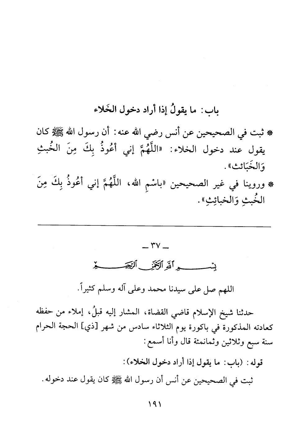 ثبت في الصحيحين عن أنس رضي الله عنه: أن رسول الله صلى الله عليه وسلم كان يقول عند دخول الخلاء: ((اللهم إني أعوذ بك من الخبث والخبائث)).