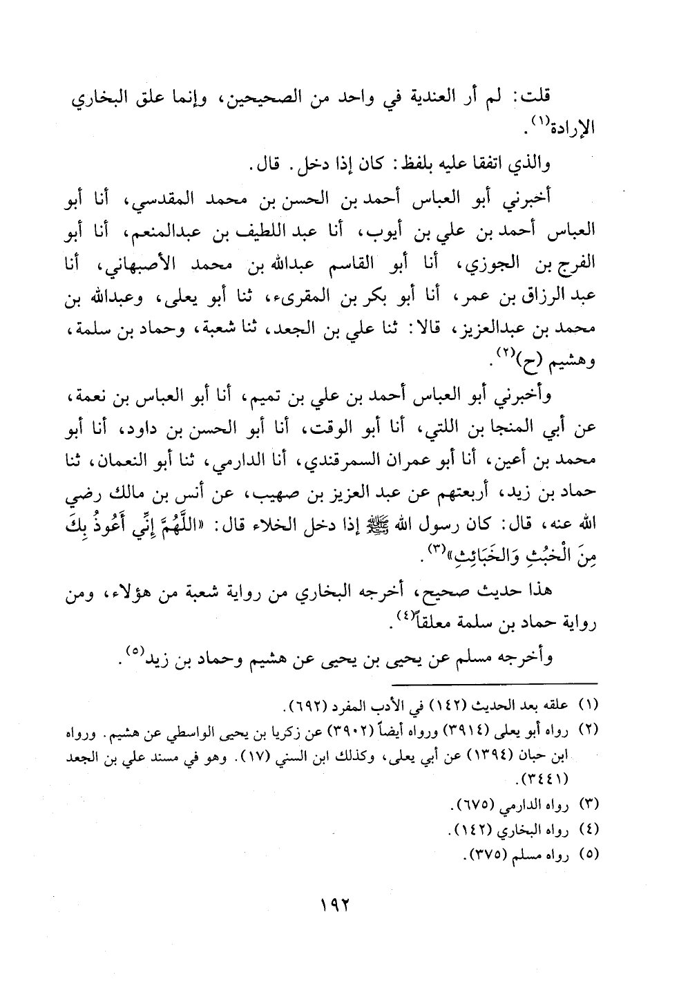 وأخبرني أبو العباس أحمد بن علي بن تميم، أنا أبو العباس بن نعمة، عن أبي المنجا بن اللتي، أنا أبو الوقت، أنا أبو الحسن بن داود، أنا أبو محمد بن أعين، أنا أبو عمران السمرقندي، أنا الدارمي، ثنا أبو النعمان، ثنا حماد بن زيد، أربعتهم عن عبد العزيز بن صهيب، عن أنس بن مالك رضي الله عنه، قال: كان رسول الله صلى الله عليه وسلم إذا دخل الخلاء قال: ((اللهم إني أعوذ بك من الخبث والخبائث)).