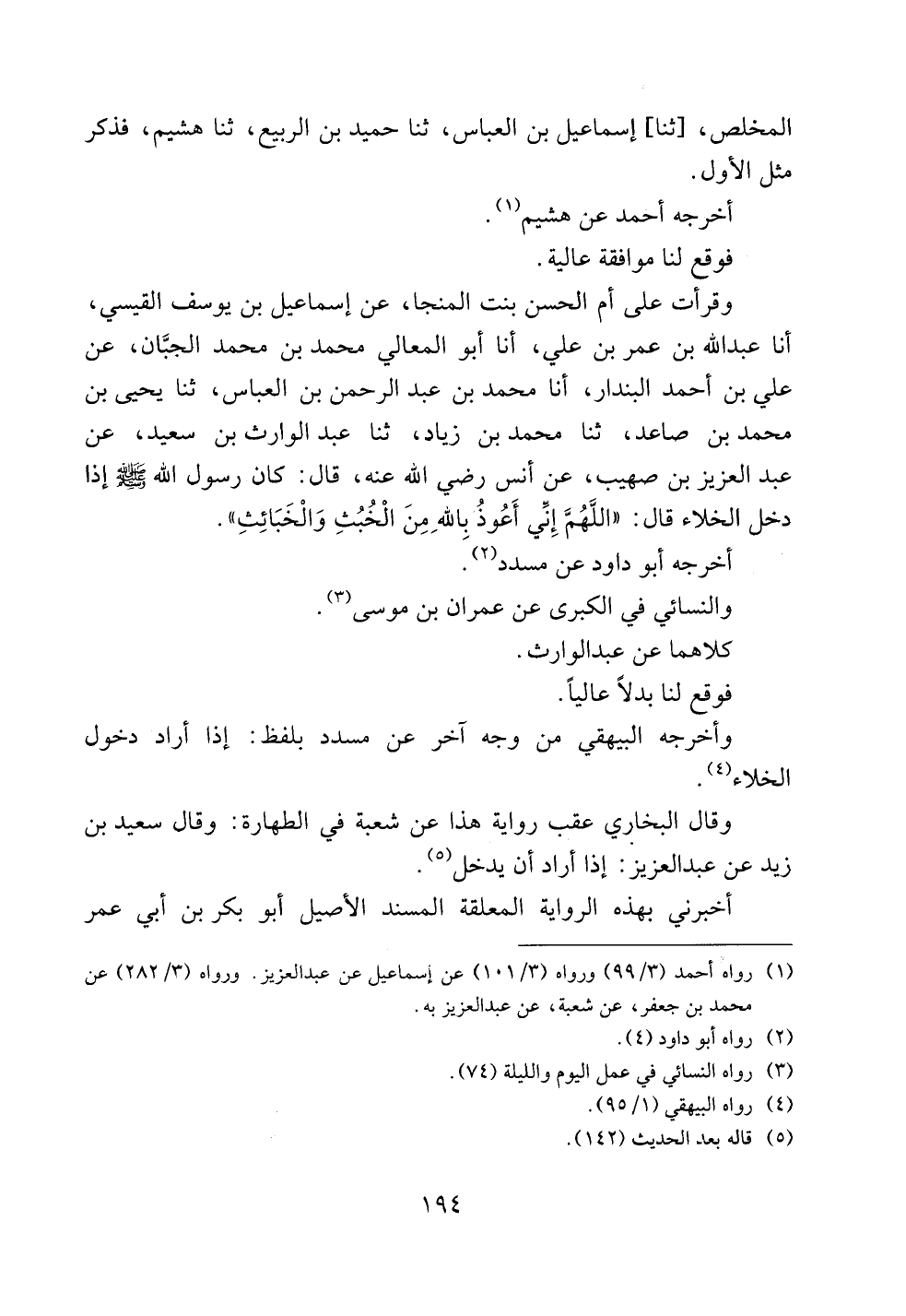 وقرأت على أم الحسن بنت المنجا، عن إسماعيل بن يوسف القيسي، أنا عبد الله بن عمر بن علي، أنا أبو المعالي محمد بن محمد الجبان، عن علي بن أحمد البندار، أنا محمد بن عبد الرحمن بن العباس، ثنا يحيى بن محمد بن صاعد، ثنا محمد بن زياد، ثنا عبد الوارث بن سعيد، عن عبد العزيز بن صهيب، عن أنس رضي الله عنه، قال: كان رسول الله صلى الله عليه وسلم إذا دخل الخلاء قال: ((اللهم إني أعوذ بالله من الخبث والخبائث)).