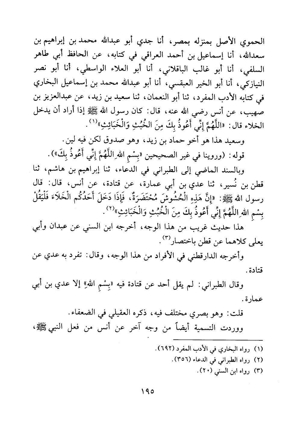 الحموي الأصل بمنزله بمصر، أنا جدي أبو عبد الله محمد بن إبراهيم بن سعدالله، أنا إسماعيل بن أحمد العراقي في كتابه، عن الحافظ أبي طاهر السلفي، أنا أبو غالب الباقلاني، أنا أبو العلاء الواسطي، أنا أبو نصر النيازكي، أنا أبو الخير العبقسي، أنا أبو عبد الله محمد بن إسماعيل البخاري في كتابه الأدب المفرد، ثنا أبو النعمان، ثنا سعيد بن زيد، عن عبد العزيز بن صهيب، عن أنس رضي الله عنه، قال: كان رسول الله صلى الله عليه وسلم إذا أراد أن يدخل الخلاء قال: ((اللهم إني أعوذ بك من الخبث والخبائث)).