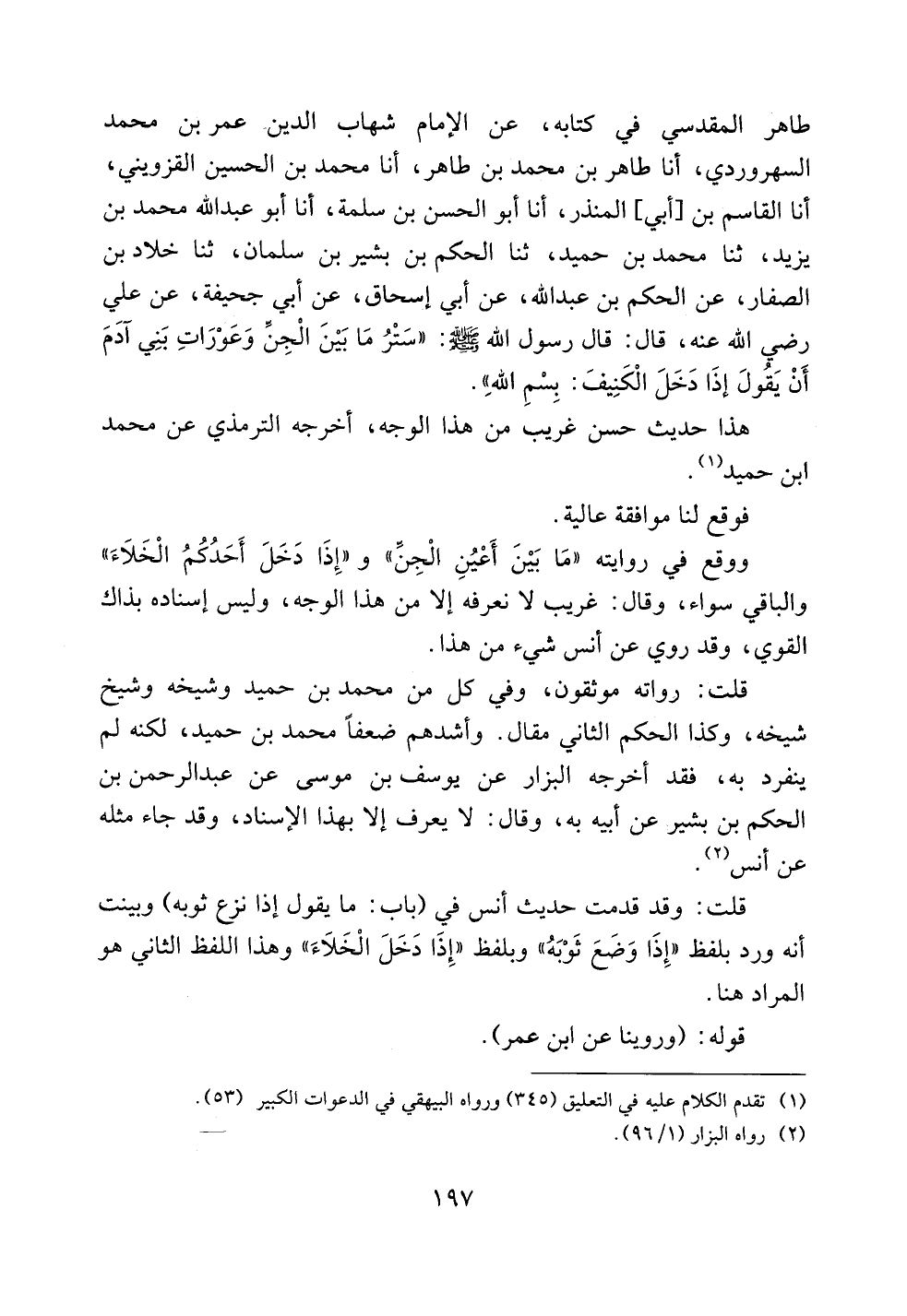 طاهر المقدسي في كتابه، عن الإمام شهاب الدين عمر بن محمد السهروردي، أنا طاهر بن محمد بن طاهر، أنا محمد بن الحسين القزويني، أنا القاسم بن [أبي] المنذر، أنا أبو الحسن بن سلمة، أنا أبو عبد الله محمد بن يزيد، ثنا محمد بن حميد، ثنا الحكم بن بشير بن سلمان، ثنا خلاد بن الصفار، عن الحكم بن عبد الله، عن أبي إسحاق، عن أبي جحيفة، عن علي رضي الله عنه، قال: قال رسول الله صلى الله عليه وسلم: ((ستر ما بين الجن وعورات بني آدم أن يقول إذا دخل الكنيف: بسم الله)).
