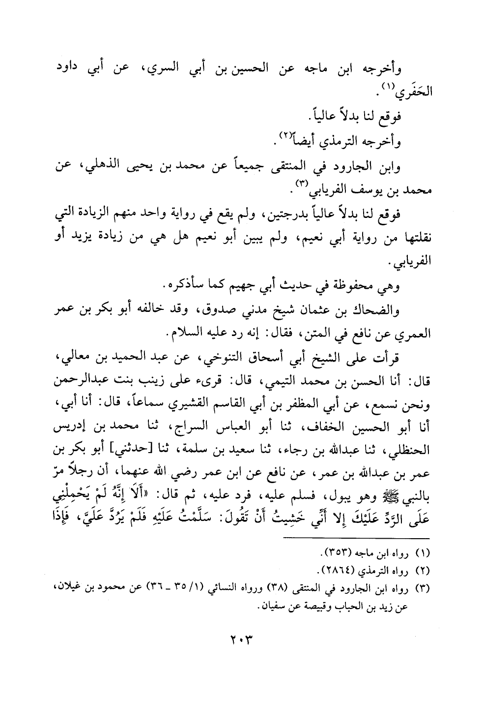 قرأت على الشيخ أبي إسحاق التنوخي، عن عبد الحميد بن معالي، قال: أنا الحسن بن محمد التيمي، قال: قرئ على زينب بنت عبد الرحمن ونحن نسمع، عن أبي المظفر بن أبي القاسم القشيري سماعاً، قال: أنا أبي، أنا أبو الحسين الخفاف، ثنا أبو العباس السراج، ثنا محمد بن إدريس الحنظلي، ثنا عبد الله بن رجاء، ثنا سعيد بن سلمة، ثنا [حدثني] أبو بكر بن عمر بن عبد الله بن عمر، عن نافع عن ابن عمر رضي الله عنهما، أن رجلاً مر بالنبي صلى الله عليه وسلم وهو يبول، فسلم عليه، فرد عليه، ثم قال: ((ألا إنه لم يحملني على الرد عليك إلا أني خشيت أن تقول: سلمت عليه فلم يرد علي، فإذا