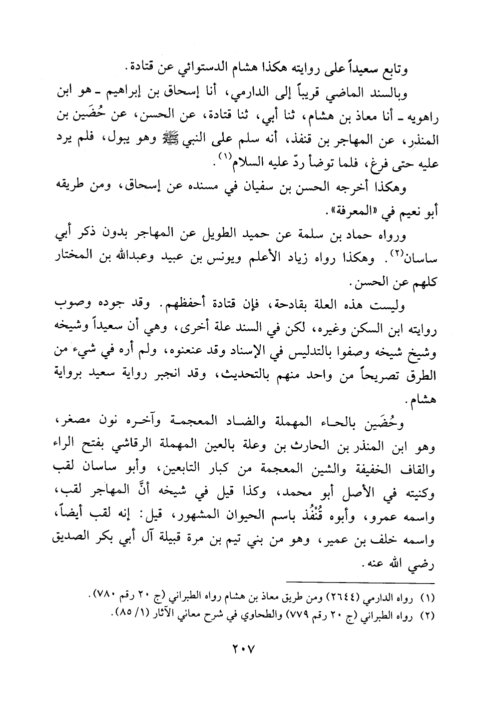 وبالسند الماضي قريباً إلى الدارمي، أنا إسحاق بن إبراهيم -هو ابن راهويه- أنا معاذ بن هشام، ثنا أبي، ثنا قتادة، عن الحسن، عن حضين بن المنذر، عن المهاجر بن قنفذ، أنه سلم على النبي صلى الله عليه وسلم وهو يبول، فلم يرد عليه حتى فرغ، فلما توضأ رد عليه السلام.