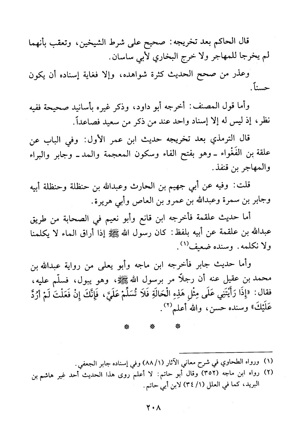 وأما حديث جابر فأخرجه ابن ماجه وأبو يعلى من رواية عبد الله بن محمد بن عقيل عنه أن رجلاً مر برسول الله صلى الله عليه وسلم، وهو يبول، فسلم عليه فقال: ((إذا رأيتني على مثل هذه الحالة فلا تسلم علي، فإنك إن فعلت لم أرد عليك)) وسنده حسن، والله أعلم.