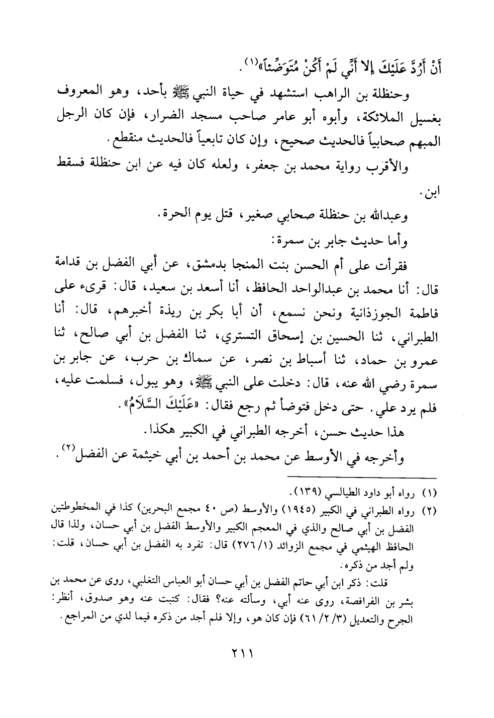 فقرأت على أم الحسن بنت المنجا بدمشق، عن أبي الفضل بن قدامة قال: أنا محمد بن عبد الواحد الحافظ، أنا أسعد بن سعيد، قال: قرئ على فاطمة الجوزذانية ونحن نسمع، أنا أبا بكر بن ريذة أخبرهم، قال: أنا الطبراني، ثنا الحسين بن إسحاق التستري، ثنا الفضل بن أبي صالح، ثنا عمرو بن حماد، ثنا أسباط بن نصر، عن سماك بن حرب، عن جابر بن سمرة رضي الله عنه، قال: دخلت على النبي صلى الله عليه وسلم، وهو يبول، فسلمت عليه، فلم يرد علي. حتى دخل فتوضأ ثم رجع فقال: ((عليك السلام)).