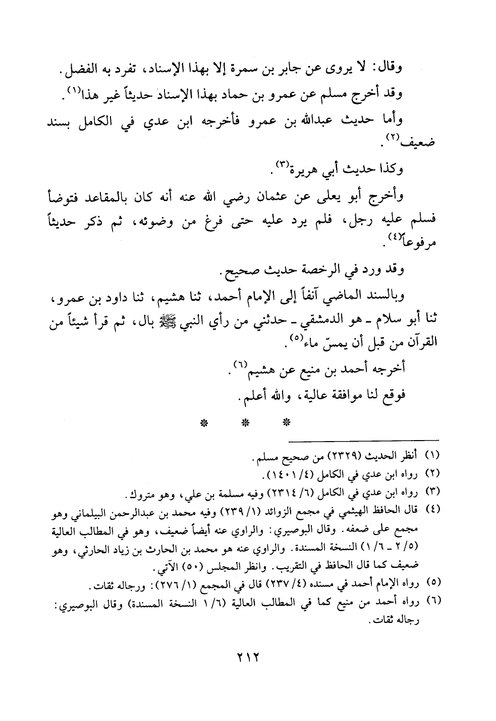 وبالسند الماضي آنفاً إلى الإمام أحمد، ثنا هشيم، ثنا داود بن عمرو، ثنا أبو سلام -هو الدمشقي- حدثني من رأى النبي صلى الله عليه وسلم بال، ثم قرأ شيئاً من القرآن من قبل أن يمس ماء.
