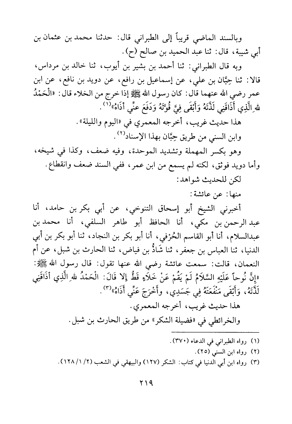 وبه قال الطبراني: ثنا أحمد بن بشير بن أيوب، ثنا خالد بن مرداس، قالا: ثنا حبان بن علي، عن إسماعيل بن رافع، عن دويد بن نافع، عن ابن عمر رضي الله عنهما قال: كان رسول الله صلى الله عليه وسلم إذا خرج من الخلاء قال: ((الحمد لله الذي أذاقني لذته وأبقى في قوته ودفع عني أذاه)).