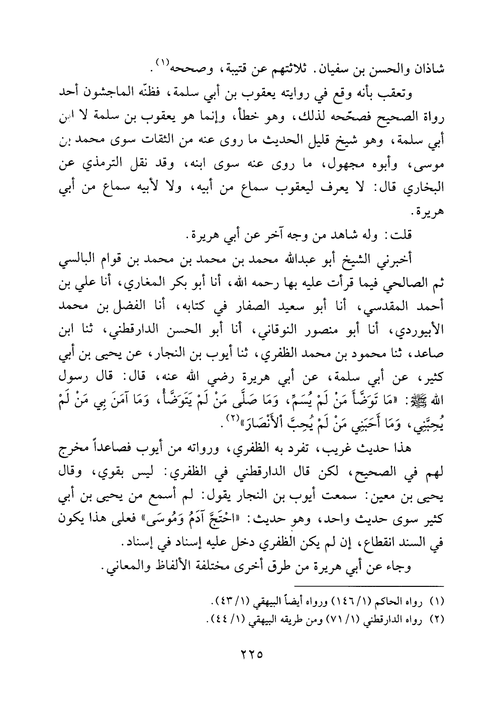 وتعقب بأنه وقع في روايته يعقوب بن أبي سلمة، فظنه الماجشون أحد رواة الصحيح فصححه لذلك، وهو خطأ، وإنما هو يعقوب بن سلمة لا ابن أبي سلمة، وهو شيخ قليل الحديث ما روى عنه من الثقات سوى محمد بن موسى، وأبوه مجهول، ما روى عنه سوى ابنه، وقد نقل الترمذي عن البخاري قال: لا يعرف ليعقوب سماع من أبيه، ولا لأبيه سماع من أبي هريرة.