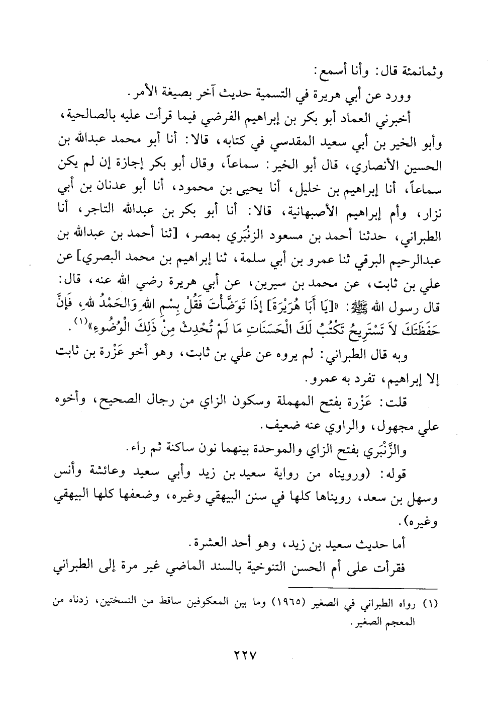 أخبرني العماد أبو بكر بن إبراهيم الفرضي فيما قرأت عليه بالصالحية، وأبو الخير بن أبي سعيد المقدسي في كتابه، قالا: أنا أبو محمد عبد الله بن الحسين الأنصاري، قال أبو الخير: سماعاً، وقال أبو بكر إجازة إن لم يكن سماعاً، أنا إبراهيم بن خليل، أنا يحيى بن محمود، أنا أبو عدنان بن أبي نزار، وأم إبراهيم الأصبهانية، قالا: أنا أبو بكر بن عبد الله التاجر، أنا الطبراني، حدثنا أحمد بن مسعود الزنبري بمصر، [ثنا أحمد بن عبد الله بن عبد الرحيم البرقي ثنا عمرو بن أبي سلمة، ثنا إبراهيم بن محمد البصري] عن علي بن ثابت، عن محمد بن سيرين، عن أبي هريرة رضي الله عنه، قال: قال رسول الله صلى الله عليه وسلم: (([يا أبا هريرة] إذا توضأت فقل بسم الله والحمد لله، فإن حفظتك لا تستريح تكتب لك الحسنات ما لم تحدث من ذلك الوضوء)).