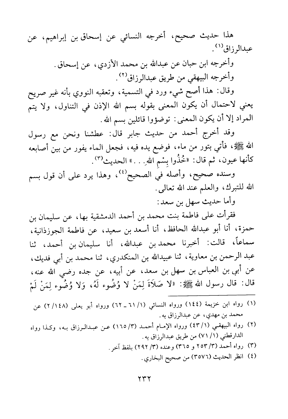 وقال: هذا أصح شيء ورد في التسمية، وتعقبه النووي بأنه غير صريح يعني لاحتمال أن يكون المعنى بقوله بسم الله الإذن في التناول، ولا يتم المراد إلا أن يكون المعنى: توضؤوا قائلين بسم الله.