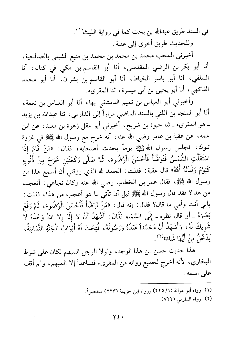 وأخبرني أبو العباس بن تميم الدمشقي بها، أنا أبو العباس بن نعمة، أنا أبو المنجا بن اللتي بالسند الماضي مراراً إلى الدارمي، ثنا عبد الله بن يزيد -هو المقرئ- ثنا حيوة بن شريح، أخبرني أبو عقل زهرة بن معبد، عن ابن عمه، عن عقبة بن عامر رضي الله عنه، أنه خرج مع رسول الله صلى الله عليه وسلم في غزوة تبوك، فجلس رسول الله صلى الله عليه وسلم يوماً يحدث أصحابه، فقال: ((من قام إذا استقلت الشمس فتوضأ فأحسن الوضوء، ثم صلى ركعتين خرج من ذنوبه كيوم ولدته أمه)) قال عقبة: فقلت: الحمد لله الذي رزقني أن أسمع هذا من رسول الله صلى الله عليه وسلم، فقال عمر بن الخطاب رضي الله عنه وكان تجاهي: أتعجب من هذا؟ فقد قال رسول الله صلى الله عليه وسلم قبل أن تأتي ما هو أعجب من هذا، فقلت: بأبي أنت وأمي ما قال؟ فقال: إنه قال: ((من توضأ فأحسن الوضوء، ثم رفع بصره -أو قال نظره- إلى السماء فقال: أشهد أن لا إله إلا الله وحده لا شريك له، وأشهد أن محمداً عبده ورسوله، فتحت له أبواب الجنة الثمانية، يدخل من أيها شاء)).