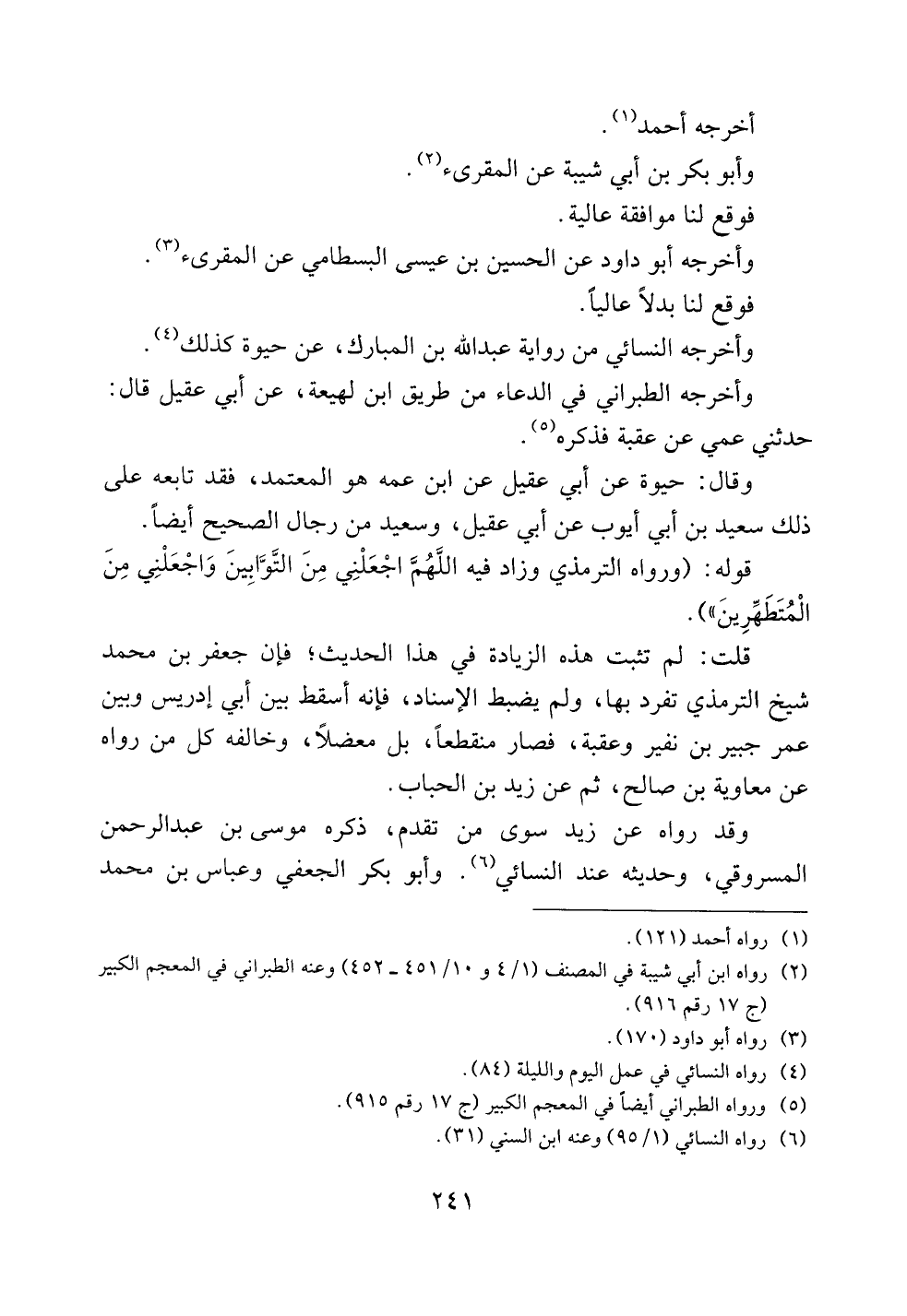 قلت: لم تثبت هذه الزيادة في هذا الحديث، فإن جعفر بن محمد شيخ الترمذي تفرد بها، ولم يضبط الإسناد، فإنه أسقط بين أبي إدريس وبين عمر جبير بن نفير وعقبة، فصار منقطعاً، بل معضلاً، وخالفه كل من رواه عن معاوية بن صالح، ثم عن زيد بن الحباب.