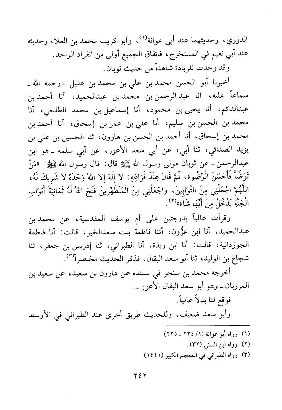 أخبرنا أبو الحسن محمد بن علي بن محمد بن عقيل -رحمه الله- سماعاً عليه، أنا عبد الرحمن بن محمد بن عبد الحميد، أنا أحمد بن عبد الدائم، أنا يحيى بن محمود، أنا إسماعيل بن محمد الطلحي، أنا محمد بن الحسن بن سليم، أنا علي بن عمر بن إسحاق، أنا أحمد بن محمد بن إسحاق، أنا أحمد بن الحسن بن هارون، ثنا الحسين بن علي بن يزيد الصدائي، ثنا أبي، عن أبي سعد الأعور، عن أبي سلمة -هو ابن عبد الرحمن- عن ثوبان مولى رسول الله صلى الله عليه وسلم قال: قال رسول الله صلى الله عليه وسلم: ((من توضأ فأحسن الوضوء، ثم قال عند فراغه: لا إله إلا الله وحده لا شريك له، اللهم اجعلني من التوابين، واجعلني من المتطهرين فتح الله له ثمانية أبواب الجنة يدخل من أيها شاء)).