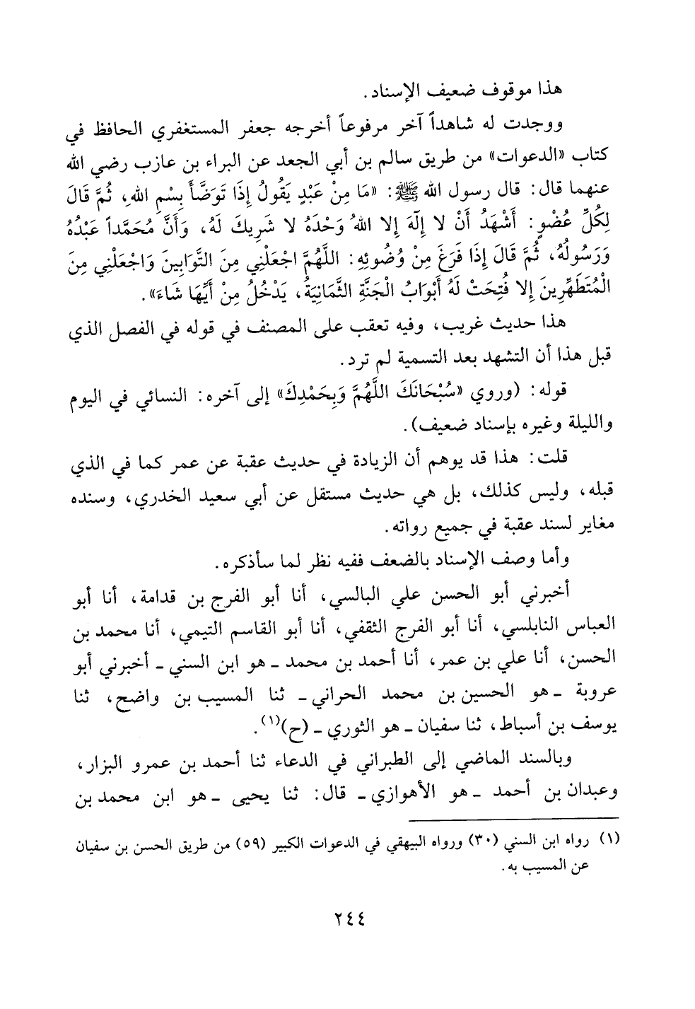ووجدت له شاهداً آخر مرفوعاً أخرجه جعفر المستغفري الحافظ في كتاب ((الدعوات)) من طريق سالم بن أبي الجعد عن البراء بن عازب رضي الله عنهما قال: قال رسول الله صلى الله عليه وسلم: ((ما من عبدٍ يقول إذا توضأ بسم الله، ثم قال لكل عضوٍ: أشهد أن لا إله إلا الله وحده لا شريك له، وأن محمداً عبده ورسوله، ثم قال إذا فرغ من وضوئه: اللهم اجعلني من التوابين واجعلني من المتطهرين إلا فتحت له أبواب الجنة الثمانية، يدخل من أيها شاء)).