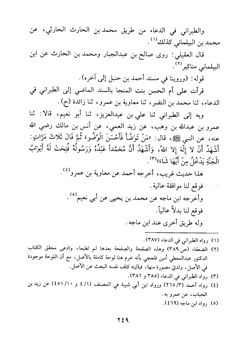 وبه إلى الطبراني ثنا علي بن عبد العزيز، ثنا أبو نعيم، قالا: ثنا عمرو بن عبد الله بن وهب، عن زيد العمي، عن أنس بن مالك رضي الله عنه، عن النبي صلى الله عليه وسلم قال: ((من توضأ فأحسن الوضوء ثم قال ثلاث مراتٍ: أشهد أن لا إله إلا الله، وأشهد أن محمداً عبده ورسوله فتحت له أبواب الجنة يدخل من أيها شاء)).