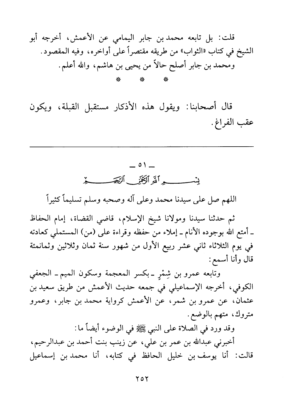 ثم حدثنا سيدنا ومولانا شيخ الإسلام، قاضي القضاة، إمام الحفاظ -أمتع الله بوجوده الأنام- إملاء من حفظه وقراءة على (من) المستملي كعادته في يوم الثلاثاء ثاني عشر ربيع الأول من شهور سنة ثمان وثلاثين وثمانمئة قال وأنا أسمع: