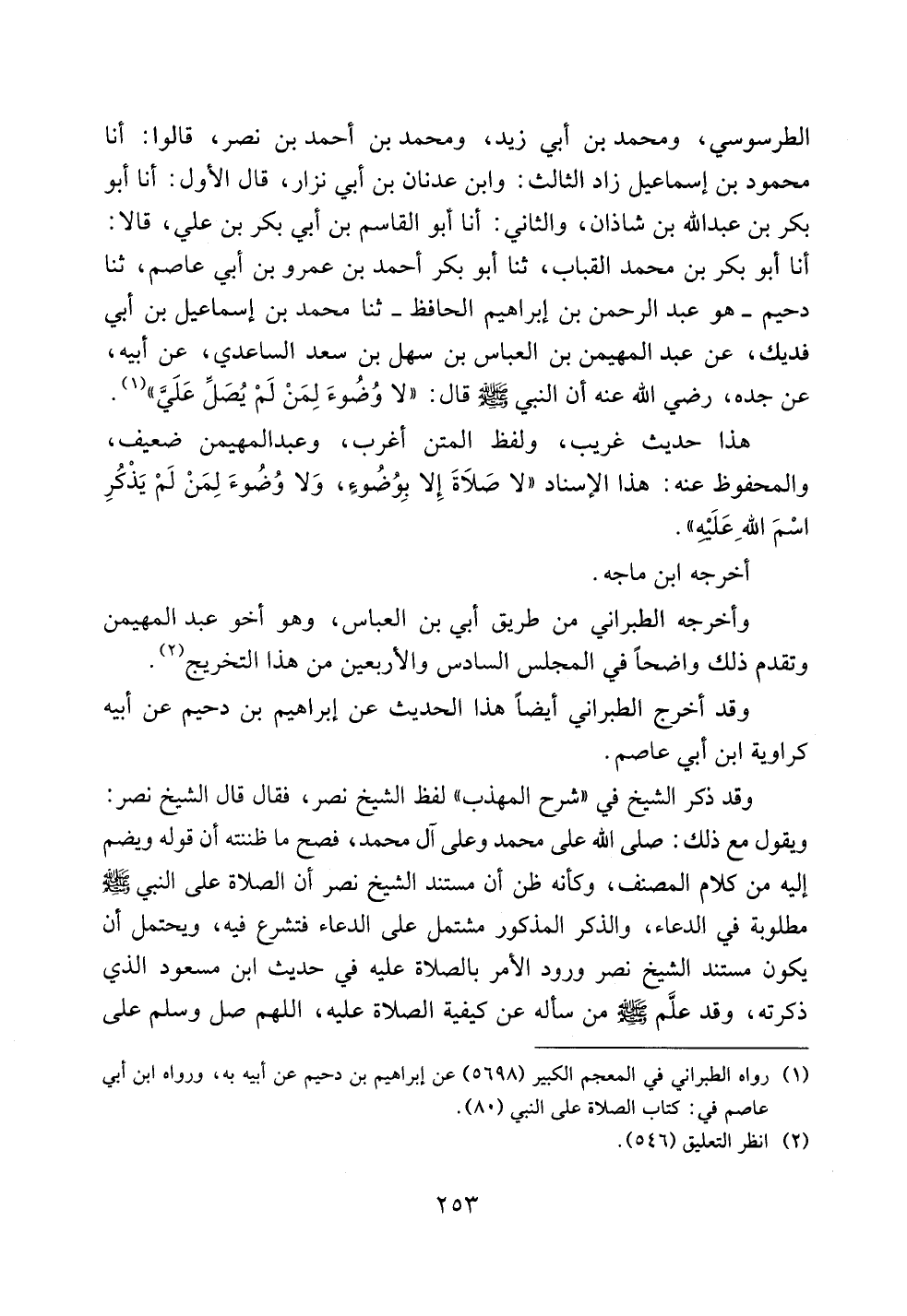الطرسوسي، ومحمد بن أبي زيد، ومحمد بن أحمد بن نصر، قالوا: أنا محمود بن إسماعيل زاد الثالث: وابن عدنان بن أبي نزار، قال الأول: أنا أبو بكر بن عبد الله بن شاذان، والثاني: أنا أبو القاسم بن أبي بكر بن علي، قالا: أنا أبو بكر بن محمد القباب، ثنا أبو بكر أحمد بن عمرو بن أبي عاصم، ثنا دحيم -هو عبد الرحمن بن إبراهيم الحافظ- ثنا محمد بن إسماعيل بن أبي فديك، عن عبد المهيمن بن العباس بن سهل بن سعد الساعدي، عن أبيه، عن جده، رضي الله عنه أن النبي صلى الله عليه وسلم قال: ((لا وضوء لمن لم يصل علي)).