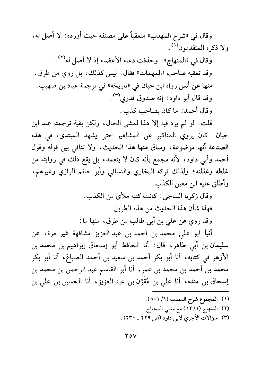 قلت: لو لم يرد فيه إلا هذا لمشى الحال، ولكن بقية ترجمته عند ابن حبان. كان يروي المناكير عن المشاهير حتى يشهد المبتدئ في هذه الصناعة أنها موضوعة، وساق منها هذا الحديث، ولا تنافي بين قوله وقول أحمد وأبي داود، لأنه مجمع بأنه كان لا يتعمد، بل يقع ذلك في روايته من غلطه وغفلته؛ ولذلك تركه البخاري والنسائي وأبو حاتم الرازي وغيرهم، وأطلق عليه ابن معين الكذب.