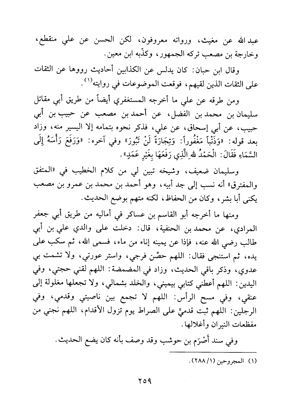 ومنها ما أخرجه أبو القاسم بن عساكر في أماليه من طريق أبي جعفر المرادي، عن محمد بن الحنفية، قال: دخلت على والدي علي بن أبي طالب رضي الله عنه، فإذا عن يمينه إناء من ماء، فسمى الله، ثم سكب على يده، ثم استنجى فقال: اللهم حصن فرجي، واستر عورتي، ولا تشمت بي عدوي، وذكر باقي الحديث، وزاد في المضمضة: اللهم لقني حجتي، وفي اليدين: اللهم أعطني كتابي بيميني، والخلد بشمالي، ولا تجعلها مغلولة إلى عنقي، وفي مسح الرأس: اللهم لا تجمع بين ناصيتي وقدمي، وفي الرجلين: اللهم ثبت قدمي على الصراط يوم تزول الأقدام، اللهم نجني من مفظعات النيران وأغلالها.