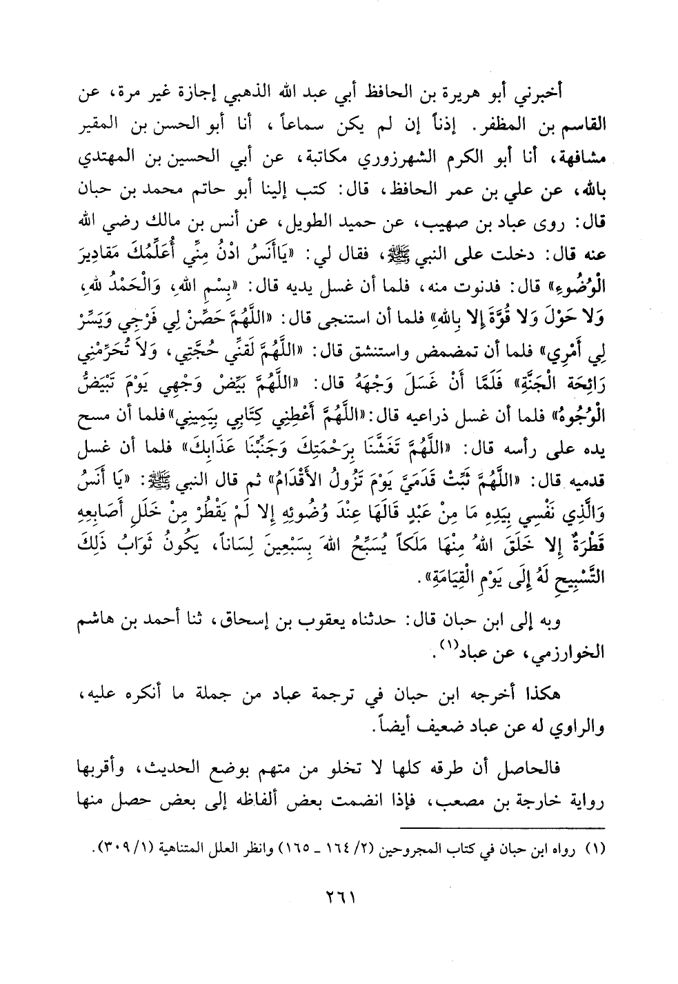 أخبرني أبو هريرة بن الحافظ أبي عبد الله الذهبي إجازة غير مرة، عن القاسم بن المظفر. إذناً إن لم يكن سماعاً، أنا أبو الحسن بن المقير مشافهة، أنا أبو الكرم الشهرزوري مكاتبة، عن أبي الحسين بن المهتدي بالله، عن علي بن عمر الحافظ، قال: كتب إلينا أبو حاتم محمد بن حبان قال: روى عباد بن صهيب، عن حميد الطويل، عن أنس بن مالك رضي الله عنه قال: دخلت على النبي صلى الله عليه وسلم، فقال لي: ((يا أنس ادن مني أعلمك مقادير الوضوء)) قال: فدنوت منه، فلما أن غسل يديه قال: ((بسم الله، والحمد لله، ولا حول ولا قوة إلا بالله)) فلما أن استنجى قال: ((اللهم حصن لي فرجي ويسر لي أمري)) فلما أن تمضمض واستنشق قال: ((اللهم لقني حجتي، ولا تحرمني رائحة الجنة)) فلما أن غسل وجهه قال: ((اللهم بيض وجهي يوم تبيض الوجوه)) فلما أن غسل ذراعيه قال: ((اللهم أعطني كتابي بيميني)) فلما أن مسح يده على رأسه قال: ((اللهم تغشنا برحمتك وجنبنا عذابك)) فلما أن غسل قدميه قال: ((اللهم ثبت قدمي يوم تزول الأقدام)) ثم قال النبي صلى الله عليه وسلم: ((يا أنس والذي نفسي بيده ما من عبدٍ قالها عند وضوئه إلا لم يقطر من خلل أصابعه قطرةٌ إلا خلق الله منها ملكاً يسبح الله بسبعين لساناً، يكون ثواب ذلك التسبيح له إلى يوم القيامة)).