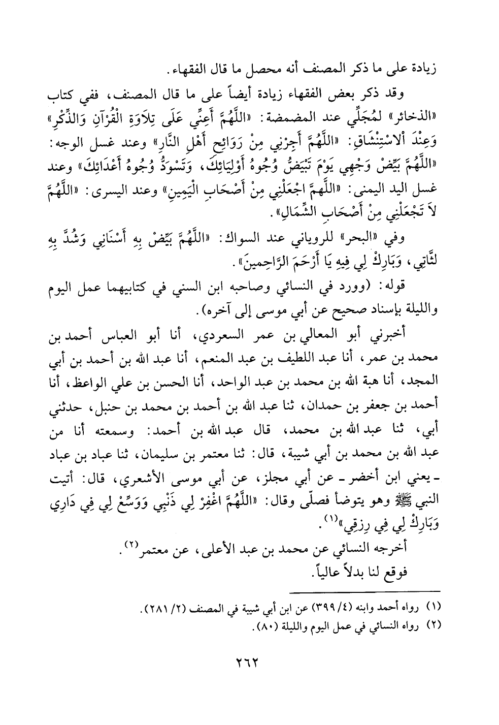 أخبرني أبو المعالي بن عمر السعردي، أنا أبو العباس أحمد بن محمد بن عمر، أنا عبد اللطيف بن عبد المنعم، أنا عبد الله بن أحمد بن أبي المجد، أنا هبة الله بن محمد بن عبد الواحد، أنا الحسن بن علي الواعظ، أنا أحمد بن جعفر بن حمدان، ثنا عبد الله بن أحمد بن محمد بن حنبل، حدثني أبي، ثنا عبد الله بن محمد، قال عبد الله بن أحمد: وسمعته أنا من عبد الله بن محمد بن أبي شيبة، قال: ثنا معتمر بن سليمان، ثنا عباد بن عباد -يعني ابن أخضر- عن أبي مجلز، عن أبي موسى الأشعري، قال: أتيت النبي صلى الله عليه وسلم وهو يتوضأ فصلى وقال: ((اللهم اغفر لي ذنبي ووسع لي في داري وبارك لي في رزقي)).