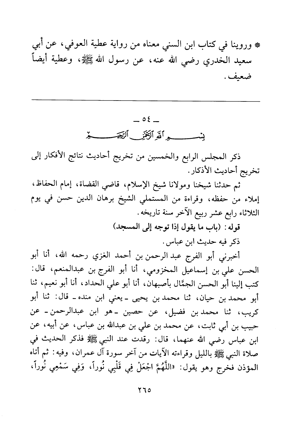 ذكر المجلس الرابع والخمسين من تخريج أحاديث نتائج الأفكار إلى تخريج أحاديث الأذكار.