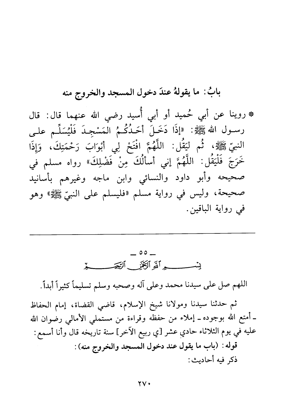 روينا عن أبي حميد أو أبي أسيد رضي الله عنهما قال: قال رسول الله صلى الله عليه وسلم: ((إذا دخل أحدكم المسجد فليسلم على النبي صلى الله عليه وسلم، ثم ليقل: اللهم افتح لي أبواب رحمتك، وإذا خرج فليقل: اللهم إني أسألك من فضلك)) رواه مسلم في صحيحه وأبو داود والنسائي وابن ماجه وغيرهم بأسانيد صحيحة، وليس في رواية مسلم ((فليسلم على النبي صلى الله عليه وسلم)) وهو في رواية الباقين.]]