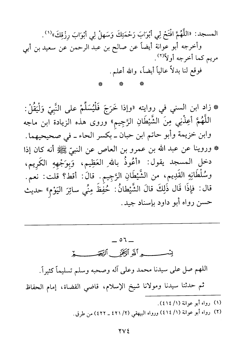 وروينا عن عبد الله بن عمرو بن العاص عن النبي صلى الله عليه وسلم أنه كان إذا دخل المسجد يقول: ((أعوذ بالله العظيم، وبوجهه الكريم، وسلطانه القديم، من الشيطان الرجيم. قال: أقط؟ قلت: نعم. قال: فإذا قال ذلك قال الشيطان: حفظ مني سائر اليوم)) حديث حسن رواه أبو داود بإسناد جيد.]]