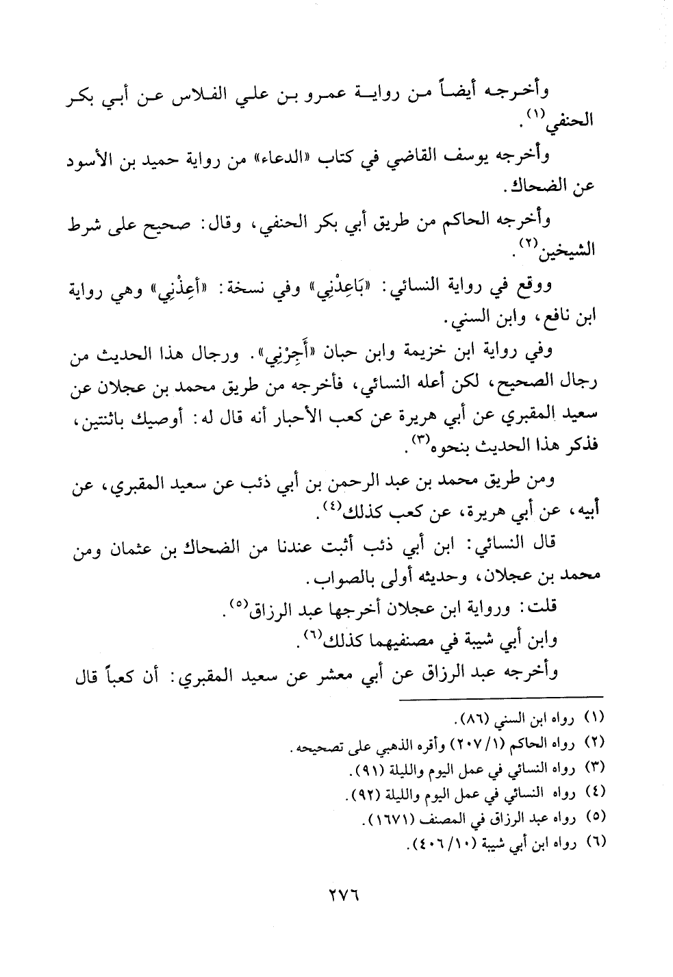 وفي رواية ابن خزيمة وابن حبان ((أجرني)). ورجال هذا الحديث من رجال الصحيح، لكن أعله النسائي، فأخرجه من طريق محمد بن عجلان عن سعيد المقبري عن أبي هريرة عن كعب الأحبار أنه قال له: أوصيك باثنتين، فذكر هذا الحديث بنحوه.
