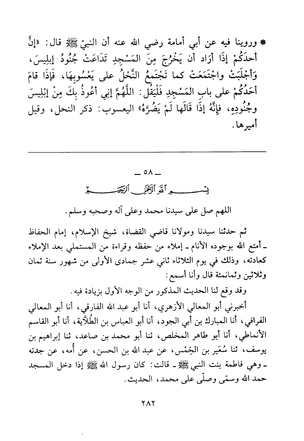 أخبرني أبو المعالي الأزهري، أنا أبو عبد الله الفارقي، أنا أبو المعالي الفرافي، أنا المبارك بن أبي الجود، أنا أبو العباس بن الطلاية، أنا أبو القاسم الأنماطي، أنا أبو طاهر المخلص، ثنا أبو محمد بن صاعد، ثنا إبراهيم بن يوسف، ثنا سعير بن الخمس، عن عبد الله بن الحسن، عن أمه، عن جدته -وهي فاطمة بنت النبي صلى الله عليه وسلم- قالت: كان رسول الله صلى الله عليه وسلم إذا دخل المسجد حمد الله وسمى وصلى على محمد، الحديث.