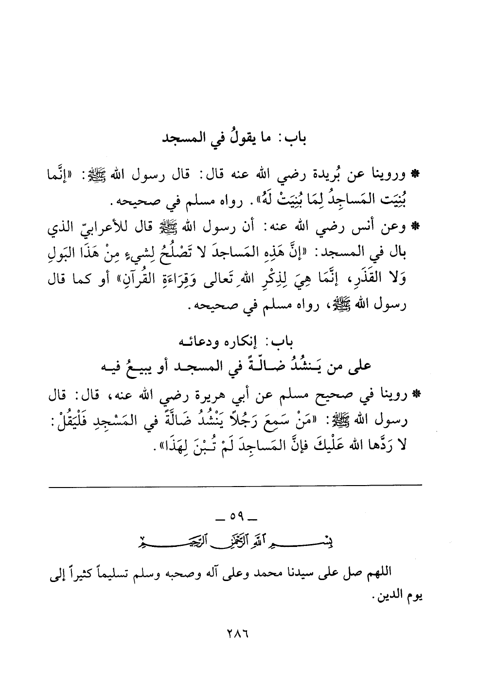 روينا في صحيح مسلم عن أبي هريرة رضي الله عنه، قال: قال رسول الله صلى الله عليه وسلم: ((من سمع رجلاً ينشد ضالةً في المسجد فليقل: لا ردها الله عليك فإن المساجد لم تبن لهذا)).]]