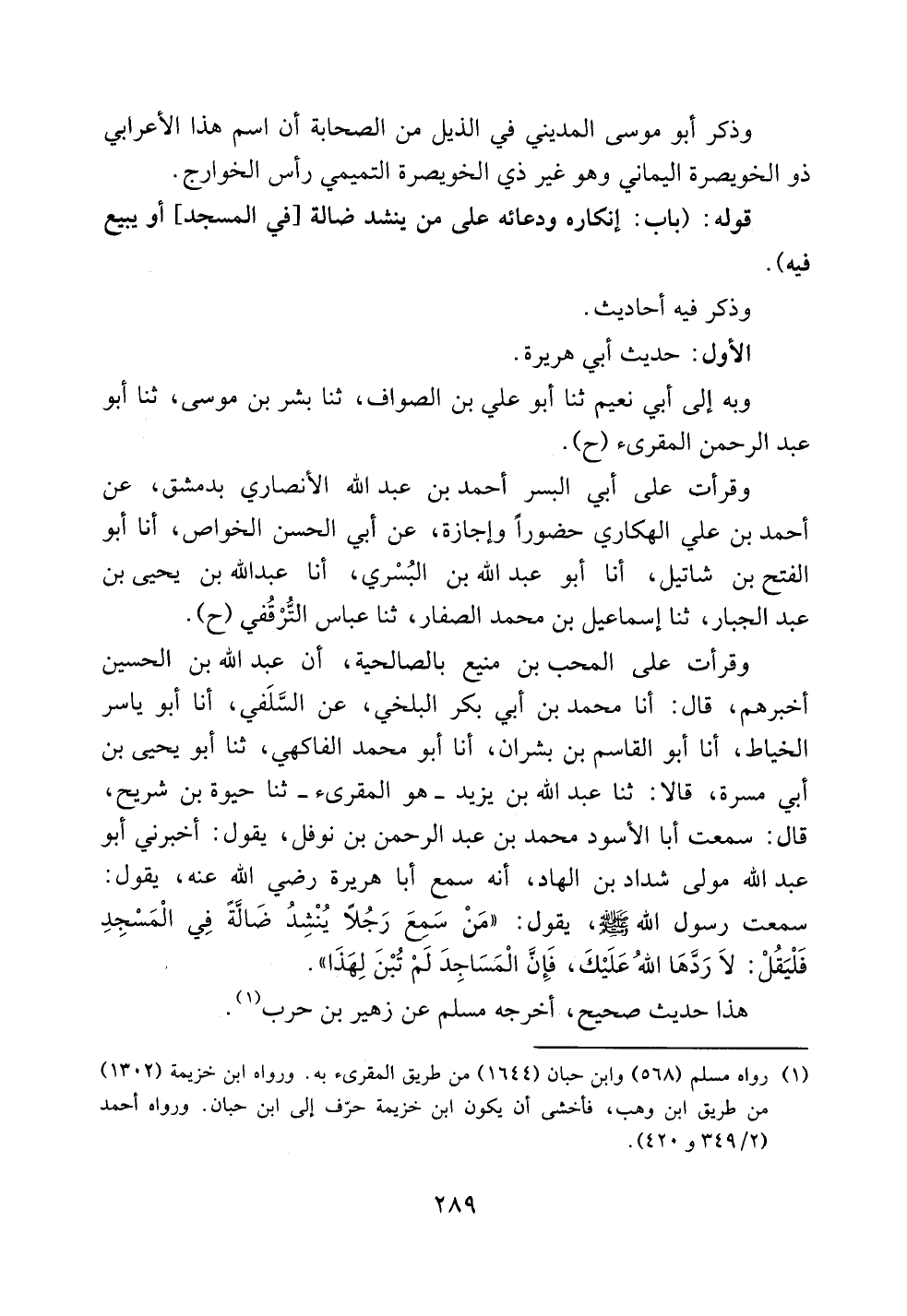 وقرأت على المحب بن منيع بالصالحية، أن عبد الله بن الحسين أخبرهم، قال: أنا محمد بن أبي بكر البلخي، عن السلفي، أنا أبو ياسر الخياط، أنا أبو القاسم بن بشران، أنا أبو محمد الفاكهي، ثنا أبو يحيى بن أبي مسرة، قالا: ثنا عبد الله بن يزيد -هو المقرئ- ثنا حيوة بن شريح، قال: سمعت أبا الأسود محمد بن عبد الرحمن بن نوفل، يقول: أخبرني أبو عبد الله مولى شداد بن الهاد، أنه سمع أبا هريرة رضي الله عنه، يقول: سمعت رسول الله صلى الله عليه وسلم، يقول: ((من سمع رجلاً ينشد ضالةً في المسجد فليقل: لا ردها الله عليك، فإن المساجد لم تبن لهذا)).