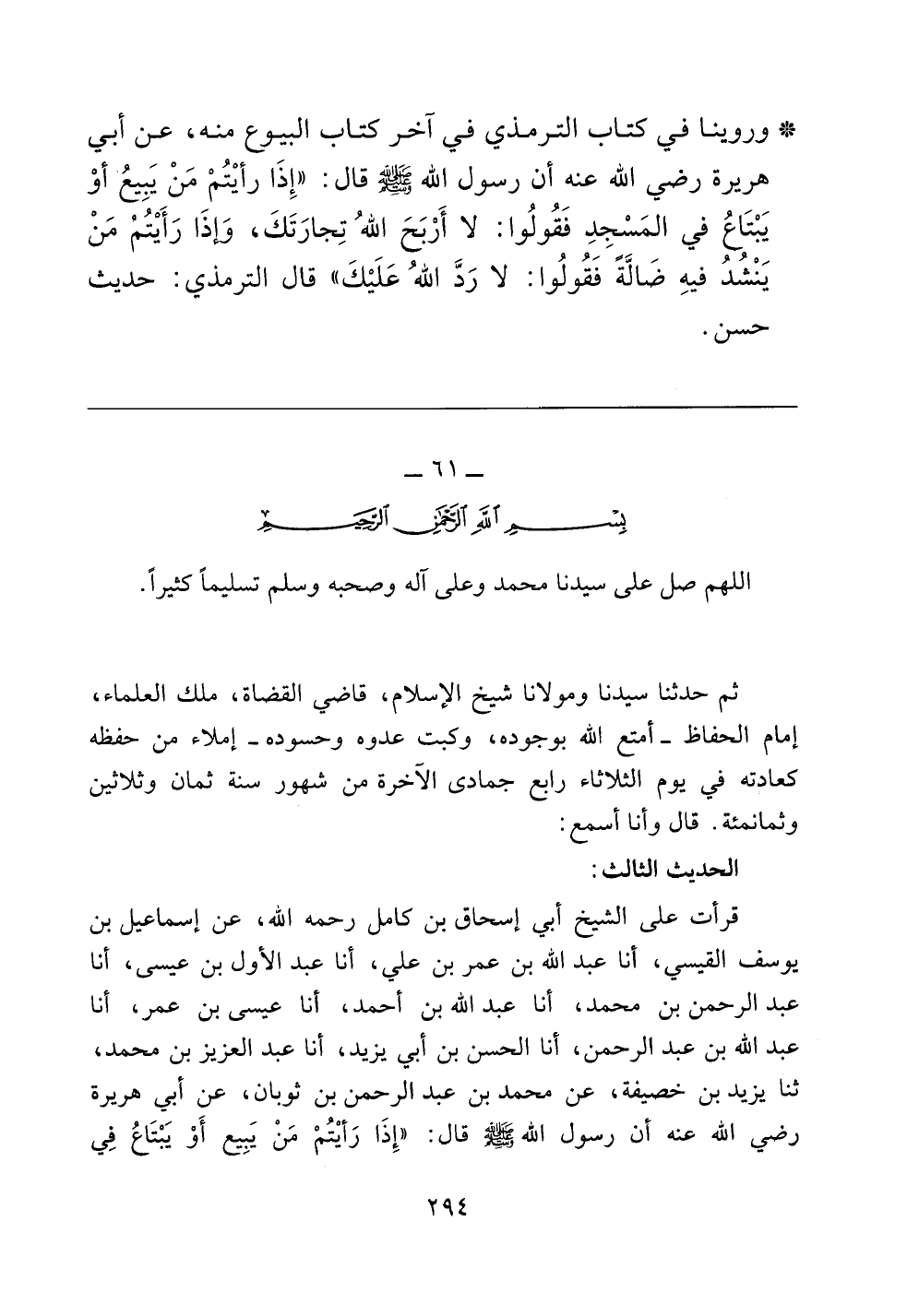 قرأت على الشيخ أبي إسحاق بن كامل رحمه الله، عن إسماعيل بن يوسف القيسي، أنا عبد الله بن عمر بن علي، أنا عبد الأول بن عيسى، أنا عبد الرحمن بن محمد، أنا عبد الله بن أحمد، أنا عيسى بن عمر، أنا عبد الله بن عبد الرحمن، أنا الحسن بن أبي يزيد، أنا عبد العزيز بن محمد، ثنا يزيد بن خصيفة، عن محمد بن عبد الرحمن بن ثوبان، عن أبي هريرة رضي الله عنه أن رسول الله صلى الله عليه وسلم قال: ((إذا رأيتم من يبيع أو يبتاع في