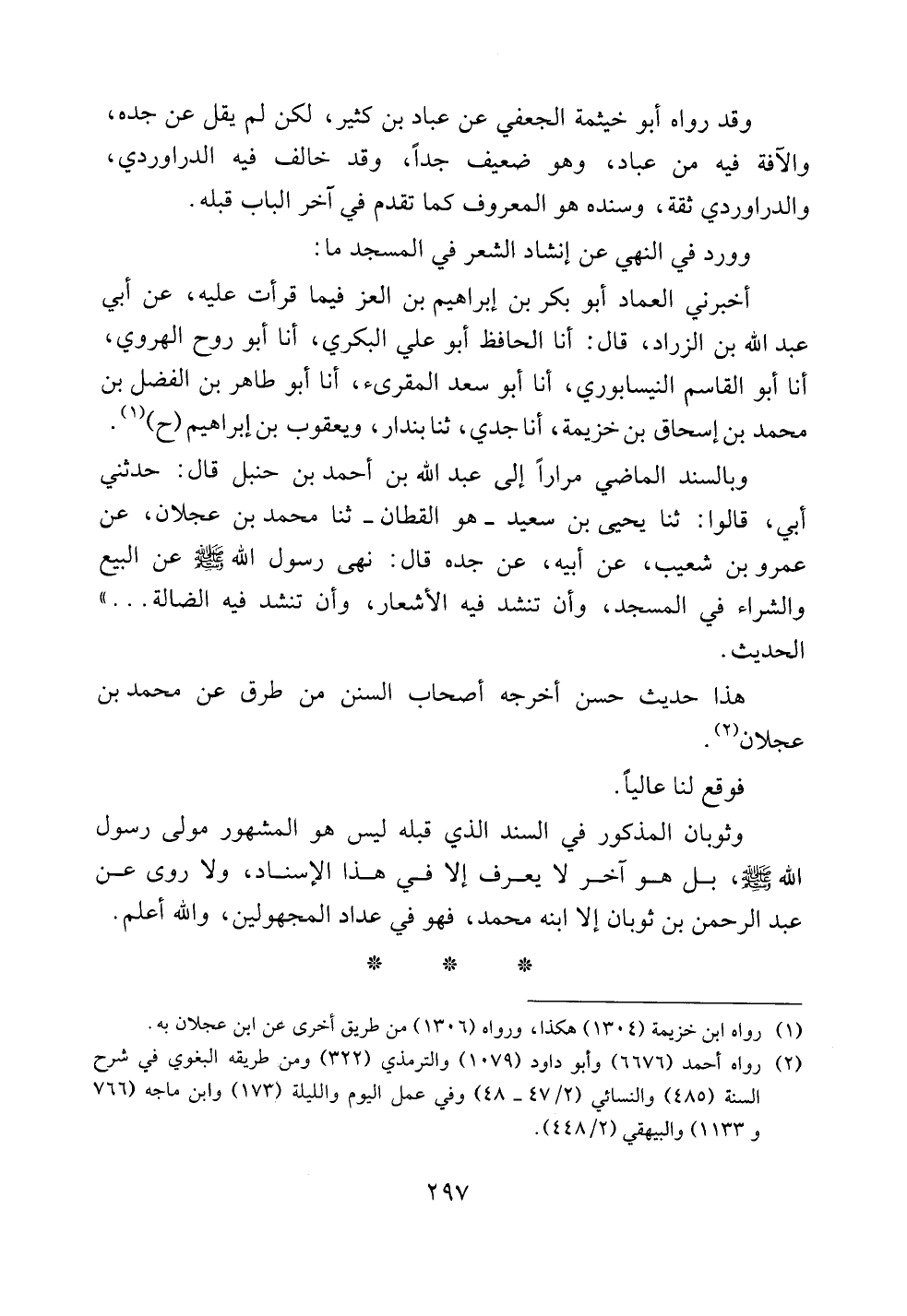 وبالسند الماضي مراراً إلى عبد الله بن أحمد بن حنبل قال: حدثني أبي، قالوا: ثنا يحيى بن سعيد -هو القطان- ثنا محمد بن عجلان، عن عمرو بن شعيب، عن أبيه، عن جده قال: نهى رسول الله صلى الله عليه وسلم عن البيع والشراء في المسجد، وأن تنشد فيه الأشعار، وأن تنشد فيه الضالة .. .. )) الحديث.
