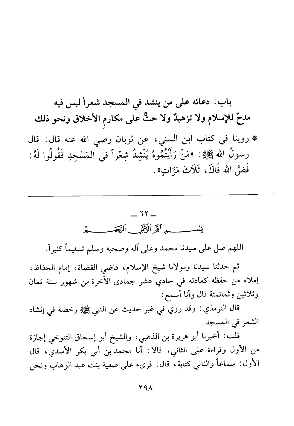 [[باب: دعائه على من ينشد في المسجد شعراً ليس فيه مدحٌ للإسلام ولا تزهيدٌ ولا حث على مكارم الأخلاق ونحو ذلك