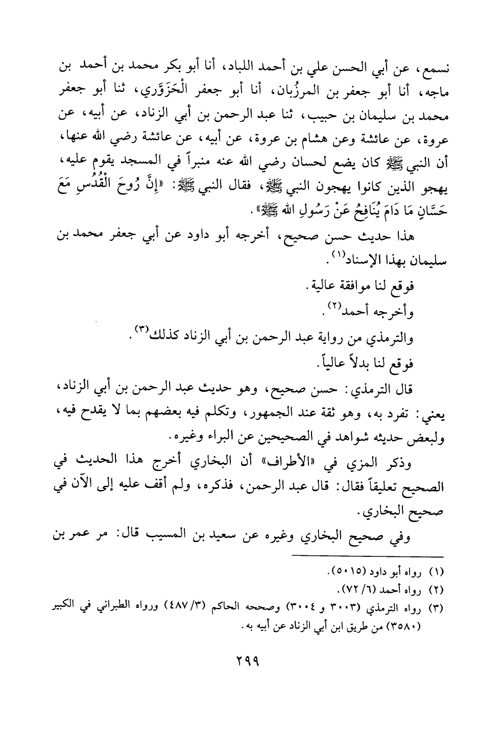 نسمع، عن أبي الحسن علي بن أحمد اللباد، أنا أبو بكر محمد بن أحمد بن ماجه، أنا أبو جعفر بن المرزبان، أنا أبو جعفر الحزوري، ثنا أبو جعفر محمد بن سليمان بن حبيب، ثنا عبد الرحمن بن أبي الزناد، عن أبيه، عن عروة، عن عائشة وعن هشام بن عروة، عن أبيه، عن عائشة رضي الله عنها، أن النبي صلى الله عليه وسلم كان يضع لحسان رضي الله عنه منبراً في المسجد يقوم عليه، يهجو الذين كانوا يهجون النبي صلى الله عليه وسلم، فقال النبي صلى الله عليه وسلم: ((إن روح القدس مع حسانٍ ما دام ينافح عن رسول الله صلى الله عليه وسلم)).