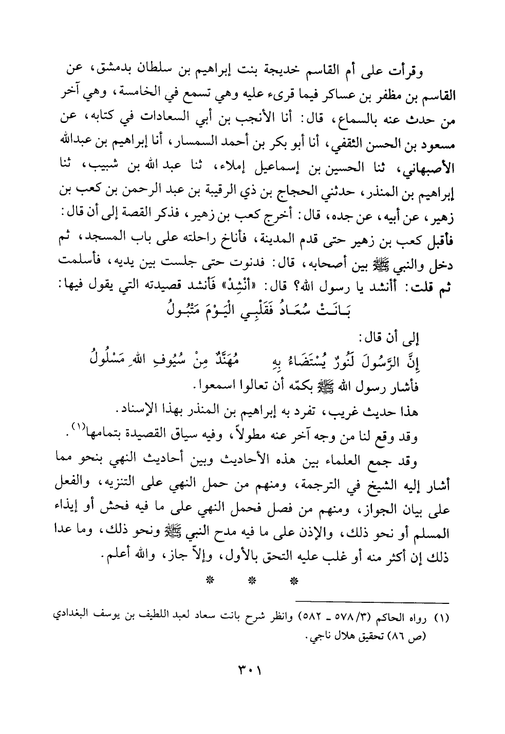 وقرأت على أم القاسم خديجة بنت إبراهيم بن سلطان بدمشق، عن القاسم بن مظفر بن عساكر فيما قرئ عليه وهي تسمع في الخامسة، وهي آخر من حدث عنه بالسماع، قال: أنا الأنجب بن أبي السعادات في كتابه، عن مسعود بن الحسن الثقفي، أنا أبو بكر بن أحمد السمسار، أنا إبراهيم بن عبد الله الأصبهاني، ثنا الحسين بن إسماعيل إملاء، ثنا عبد الله بن شبيب، ثنا إبراهيم بن المنذر، حدثني الحجاج بن ذي الرقيبة بن عبد الرحمن بن كعب بن زهير، عن أبيه، عن جده، قال: أخرج كعب بن زهير، فذكر القصة إلى أن قال: فأقبل كعب بن زهير حتى قدم المدينة، فأناخ راحلته على باب المسجد، ثم دخل والنبي صلى الله عليه وسلم بين أصحابه، قال: فدنوت حتى جلست بين يديه، فأسلمت ثم قلت: أأنشد يا رسول الله؟ قال: ((أنشد)) فأنشد قصيدته التي يقول فيها: